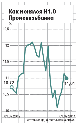 Коэффициент общей достаточности капитала (Н1.0) на 1 сентября составил 11% при минимальном уровне в 10% (см. график). По словам Констандяна, Н1.0 в 11% не дает большого запаса для роста кредитования, а перспективы роста именно в этом и возможных приобретениях. Кредиты корпоративным клиентам в этом году будут расти вдвое быстрее розницы и прибавят 30%, предрекает он. В отчетности картина несколько иная: в первом полугодии корпоративный портфель банка вырос на 13% до 450 млрд руб., кредитный портфель МСБ - лишь на 2% до 85 млрд руб., розница - на 13% до 72 млрд руб.