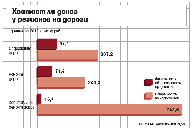 Регионам не хватает средств, чтобы выполнить поручение президента Владимира Путина удвоить темпы строительства дорог: в региональных фондах средств даже меньше, чем нужно на текущее содержание и ремонт (см. график). Проекты с использованием частных инвестиций рассматриваются как один из вариантов решения проблемы, говорит федеральный чиновник, курирующий инфраструктуру. Однако это точечный инструмент, подобных проектов вряд ли будет много - поручение таким образом не выполнишь, признает собеседник «Ведомостей». Это не значит, что такие инициативы не нужны, подчеркивает другой федеральный чиновник. Лучше построить или реконструировать участки трасс там, где это наиболее необходимо, даже если нужно привлечь больше финансирования, а не нагонять километраж за счет однополосных дорог где-нибудь в степях, объясняет чиновник.