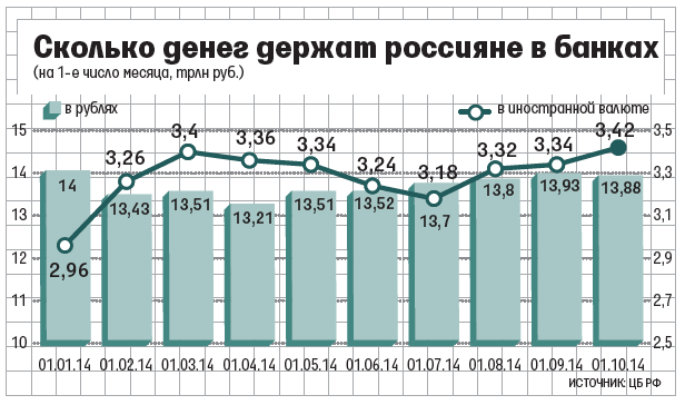 С начала года рост вкладов резко замедлился, летом был небольшой приток, сейчас он прекратился, говорит аналитик «ВТБ капитала» Михаил Никитин. «У этих колебаний явная корреляция с курсом доллара: прежде всего граждане переводят сбережения в наличный доллар, в начале года также был некоторый рост спроса на недвижимость - накопленное отдавали в качестве взносов за ипотеку, - продолжает он. - Третье направление - офшорное: нет уверенности, что это весомая доля оттока, но, естественно, деньги за границу уходили».