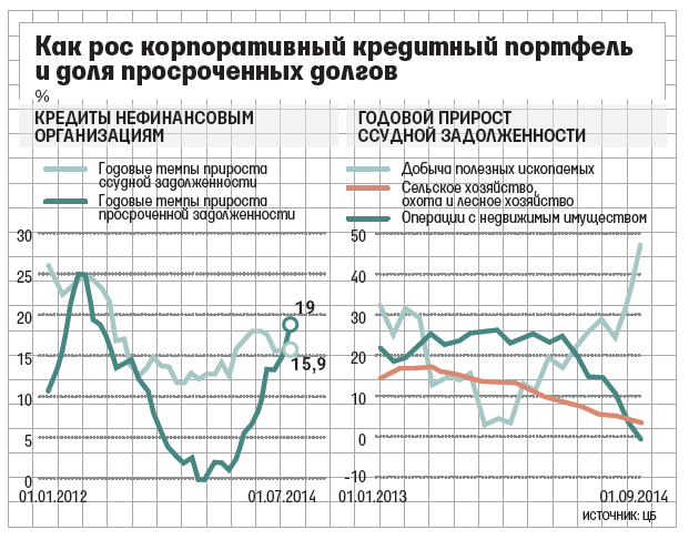 В последней отчетности ЦБ значительного ухудшения не видно: за восемь месяцев, прошедших с начала этого года, просрочка по кредитам, выданным банкам реальному сектору, выросла с 4,2 до 4,5%. На этом фоне резко выделяется строительный сектор: с апреля 2014 г. просроченные долги строителей выросли на 0,4 п. п. до 7,6%. У сельхозпроизводителей просроченные долги выросли за то же время на 2,4 п. п. - проблемным является каждый десятый кредит (9,4%).