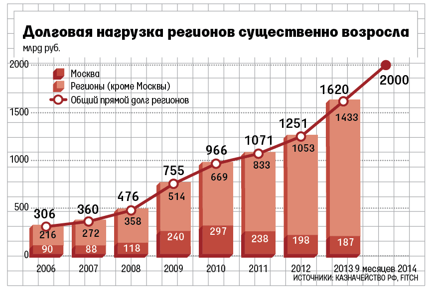 За год долг регионов вырос на 25% и к началу сентября (с учетом муниципалитетов) составил 2 трлн руб., или около 30% их доходов без учета федеральных трансфертов. 12 месяцев назад долг составлял 1,6 трлн руб., или 24% доходов, отмечает Карен Вартапетов из S&P, примерно у 35 регионов долг превышает 50% доходов без учета трансфертов, а примерно у 15 - 75%.