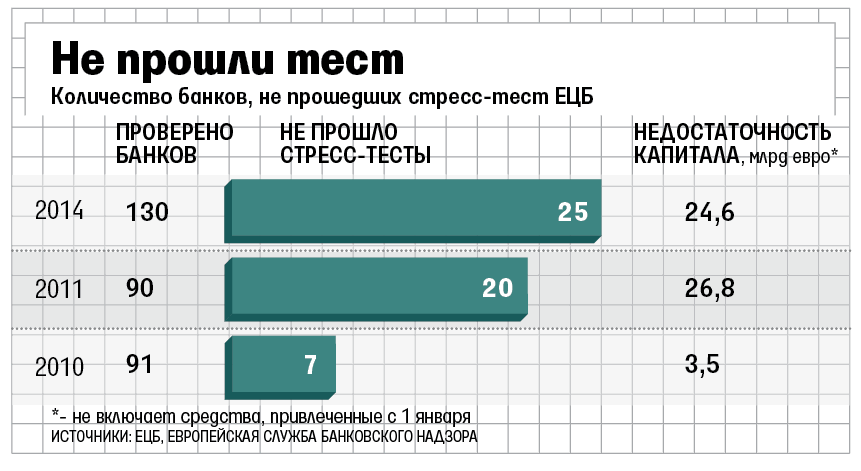 Стресс-тесты ЕЦБ и Европейской службы банковского надзора (EBA) на финансовую устойчивость не прошло 25 из 130 европейских банков. В числе крупнейших итальянский Banca Monte dei Paschi di Siena и греческий Eurobank Ergasias.