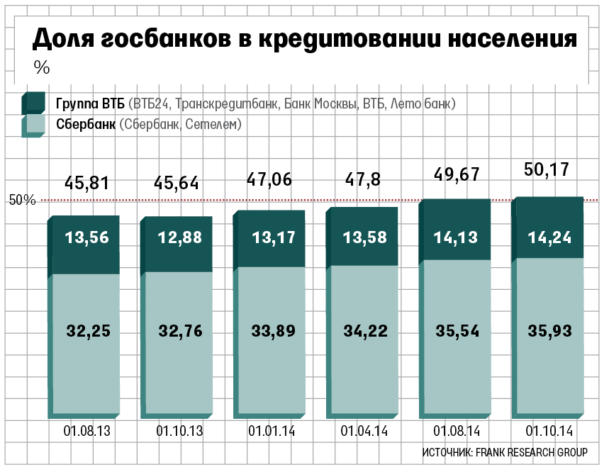 По расчетам Frank RG, доля госбанков чуть меньше, но также больше половины - 50,17% (см. график).