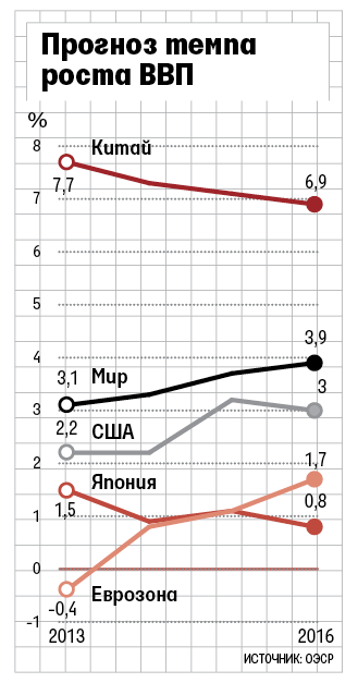 ОЭСР ждет ускорения роста мирового ВВП, в частности благодаря разгоняющейся экономике США. Темпы роста экономики еврозоны будут низкими, экономика Китая будет постепенно сбрасывать обороты (см. график). Индекс торговой активности (отношение экспорта и импорта к ВВП) во всех основных экономиках ниже средних значений 1990-2007 гг. «Пока есть время, необходимо изменить фискальную и кредитно-денежную политику, а также провести структурные реформы, это три кита мировой экономики», - говорится в докладе ОЭСР.