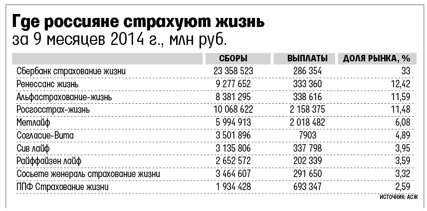 Сократили сборы и другие страховщики жизни, связанные с банками: «ППФ страхование жизни» (-74,6% к III кварталу 2013 г.), «Ренессанс жизнь» (-43%), «Сосьете женераль страхование жизни» (-8%).