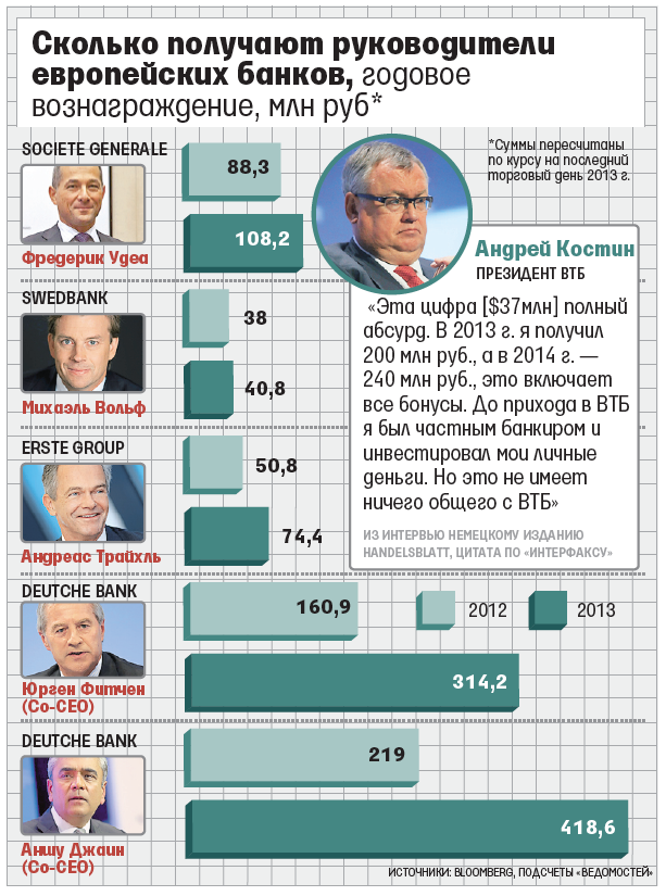 Президент ВТБ Андрей Костин заявил, что в 2013-2014 гг. заработал 440 млн руб. Это заметно превышает заработки руководителей европейских банков