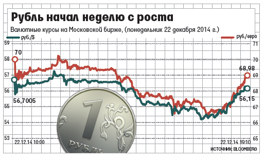 Вчера на Московской бирже курс доллара опускался на 4,7 руб. до 54,1 руб./$, евро - на 6,2 руб. до 66,2 руб./евро. Правда, к вечеру рубль сдал часть позиций: к 19.00 мск - 55,9 руб./$ и 68,5 руб./евро.