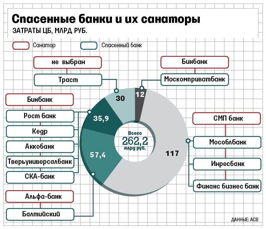На финансовое оздоровление банки попадали по разным причинам. Так, к санации банка «Балтийский» привел затянувшийся конфликт акционеров - Олега Шигаева и Андрея Исаева: пока они делили банк, спорили о его продаже и искали справедливости в суде, банк медленно умирал. Дыра в нем за это время разрослась до 30 млрд руб. В итоге кредитная организация досталась Альфа-банку, на восстановление банка ЦБ выделил 57,4 млрд руб.