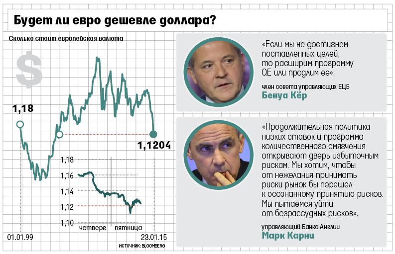 Из-за начала стимулирующей программы евро снова дешевеет. В пятницу его курс снижался до $1,1115, что заставляет аналитиков пересматривать прогнозы. «Несколько месяцев назад я бы сказал, что до паритета евро с долларом еще несколько лет, - говорит начальник отдела валютных операций в Европе PIMCO Томас Крессин, - теперь этого нельзя исключать уже до конца года». Morgan Stanley понизил прогноз на конец года с $1,12 до $1,05/евро. Bank of America Merrill Lynch ожидает в конце года $1,1/евро (ранее говорил о $1,2), HSBC - $1,09 (ранее - $1,15).