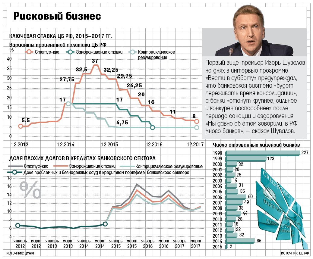 С точки зрения академической аналитики оптимально 300-500 банков, а у нас - больше 800, потенциал для сокращения колоссальный, ничего страшного нет, говорит Орлова. «На топ-200 банков приходится около 95% банковского сектора на разных рынках, - напоминает она. - Уход остальных банков, обслуживающих 5% рынка, для экономики не катастрофичен. В основном это карманные банки, которые не выполняют главную банковскую функцию по кредитованию экономики». Данилов еще более категоричен: для российской банковской системы нужно гораздо меньше банков, чем сейчас, - 200 максимум. Он, впрочем, не считает мелкие банки обреченными, ведь у многих из них коэффициент капитализации выше, чем у крупных банков, так что главное - чтобы не было оттока депозитов.