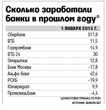 Не все банки топ-10 закончили год с прибылью: доналоговый убыток Банка Москвы - 10,5 млрд руб. (чистая прибыль 1,2 млрд руб. из-за признания налогового актива), Россельхозбанка - 19,9 млрд, Промсвязьбанка - 4,4 млрд.