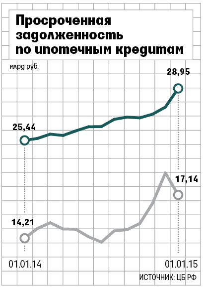 Для финансирования валютной ипотеки банки привлекали валютное фондирование, поэтому им выгоднее получить текущий курс для рефинансирования, указывает он. Но сейчас, когда возникает необходимость повышать резервы из-за роста просроченных долгов, а стоимость залоговой недвижимости в долларах снижается, банки вынуждены идти на компромисс с заемщиками. Им придется заметно увеличить резервы по валютной ипотеке, портфель резко вырос за счет девальвации, а его качество ухудшается заметно быстрее рублевых кредитов. Просроченная задолженность физлиц по рублевой ипотеке в 2014 г. выросла на 14% до 29 млрд руб., в валюте - на 20% до 17 млрд руб. (см. график).