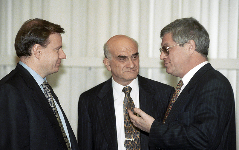 Первый вице-премьер правительства Владимир Потанин (слева), министр экономики РФ Евгений Ясин (в центре) и вице-премьер правительства, министр финансов Александр Лившиц (справа).