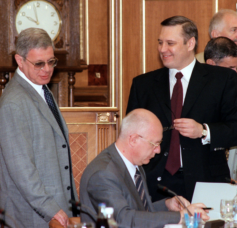Министр финансов Михаил Касьянов, министр экономики Андрей Шаповальянц и представителя президента по делам «Большой восьмерки» Александр Лившиц (справа налево).
