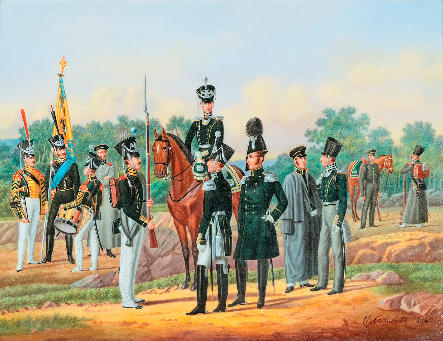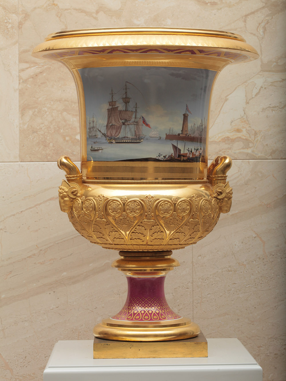 На старейшей в России фарфоровой мануфактуре предметы, которые «служили летописью достопамятнейших событий и побед», создавались с XVIII столетия, но именно в XIX веке, после победы российской армии в Отечественной войне 1812 года, эта тема стала одной из центральных. В XIX – начале ХХ века сражения и боевые будни запечатлели лучшие художники Императорского фарфорового завода. К героической истории российской армии обращены не только тарелки, но вазы, и фарфоровые пласты (пластина с живописным изображением, которая может использоваться как картина или для декорирования столиков, шкатулок, ваз). «Такие изделия были гордостью каждого российского монарха», – отмечает Владимир Голубев.