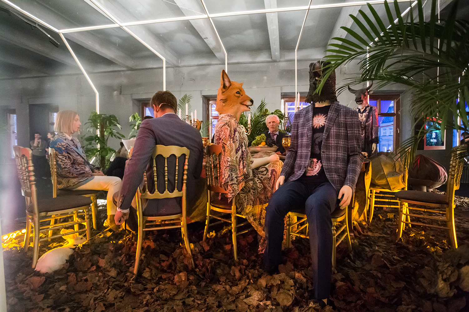 «Перед нами стояла задача оживить идею, которая родилась у итальянского модного Дома. В секции, которая называется «Природа», мы посадили за большим столом прототип большой «семьи» Этро (часто изображающих себя с головами животных, как и на обложке юбилейной книги. – Прим. ред.) с различными артефактами: там было и подобие джунглей, и настоящие кролики, хамелеоны и совы, и сидящие за длинным столом люди-звери... Павильон «Арт» мы превратили в некий склад сложенных в ящики предметов искусства, где итальянский художник рисует красивую латинскую типографику прямо на теле модели. В части «Цвет» можно было надеть специальные наушники и услышать, о чем «говорят» ткани. В блоке «Игра» представлена новая коллекция Etro весна-лето 2018, и в ее презентации были задействованы танцоры и циркачи. В последней части, «Путешествие», можно было видеть представителей различных народностей – так мы показали многочисленные культурные влияния на эстетику и стиль Etro: от Фриды Кало до самураев, китайских купцов и эскимосов», – пояснила режиссер.