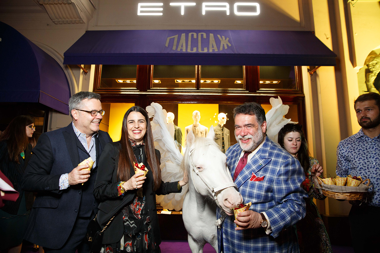 «Это не просто ретроспектива – это иммерсивный театр под крышей пассажа, интерактивное общение с подготовленными людьми, поэтому давайте общаться!» – призывал гостей вечера Михаил Куснирович, глава Bosco di Ciliegi. Артисты в костюмах Etro танцевали, пели, философствовали и декламировали стихи внутри павильонов, погружая зрителей в мир Etro.