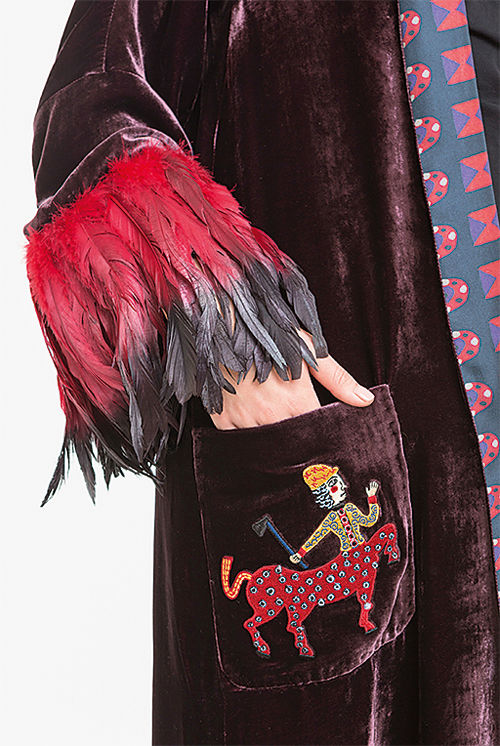 Год назад первыми предметами женской одежды Gourji стали роскошные халаты – шелковые и бархатные, с ручной вышивкой и аппликацией, с декором из перьев, которые были хороши и с вечерним платьем, и с джинсами. Да и фантазировать на этом большом пространстве, признается Наталья, было проще.