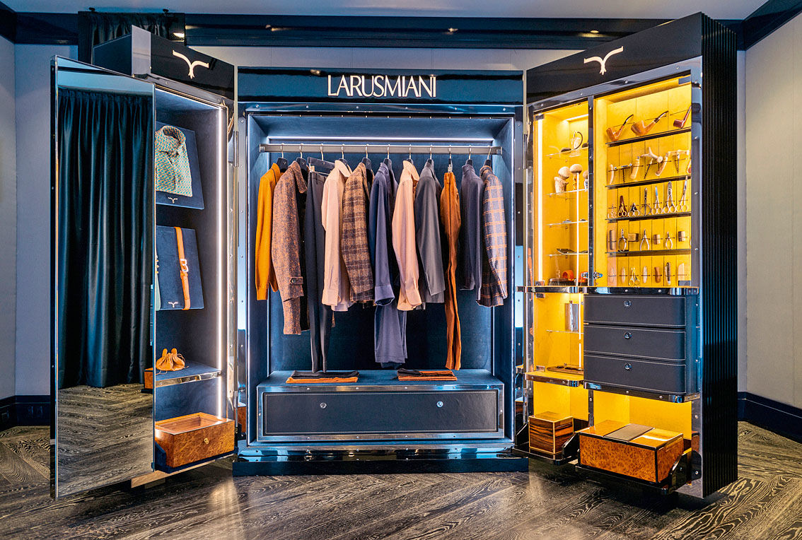 В ТЦ «Времена года» по инициативе компании «Кашемир и шелк», открылся первый в России корнер итальянского производителя мужской одежды и аксессуаров Larusmiani. Интерьер привлекает своей оригинальностью: заходя в бутик, оказываешься в...трехстворчатом гардеробе в ретростиле. При этом винтажность черного дерева, темно-синего бархата и кожи гармонирует с современными мотивами – с полированной сталью, плексигласом и подсветкой. В «шкафу» разместились брюки, джинсы, галстуки и ремни, а также сопутствующие товары для джентльменов: бритвенные принадлежности, штопоры, курительные трубки, наборы по уходу за обувью.