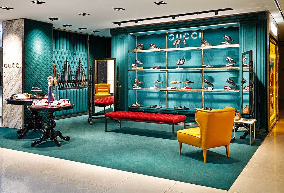 Сразу два корнера Gucci начали работу в ЦУМе. В одном продаются аксессуары (как мужские, так и женские), а в другом – мужская обувь. В оформлении интерьеров использована новая концепция, которая уже была реализована во флагманском бутике Gucci на via Montenapoleone в Милане: сочетание индустриального и романтического стилей. Массивные поверхности с миниатюрными металлическими элементами гармонируют с яркими кожаными креслами и бархатными пуфами.