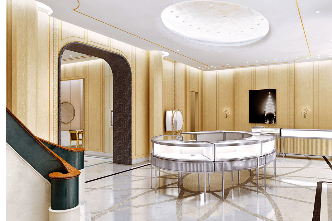 Работавшие над обликом магазина архитекторы и дизайнеры объединили в элегантном интерьере и архивные мотивы, которые можно видеть в облике исторического бутика Дома на 5-й авеню, и современную утонченную мебель, и универсальные художественные мотивы. Геометрические линии серого и черного цветов на белом мраморе пола на первом этаже магазина отзываются эхом в ар-деко-силуэте лестницы, ведущей на второй этаж. Рассеянный мягкий свет скрытых в белом потолке светильников высвечивает еле читаемые растительные мотивы на стенных панелях. Одну из стен бутика украшают ширмы с изображением японской сакуры в стиле ар-нуво.