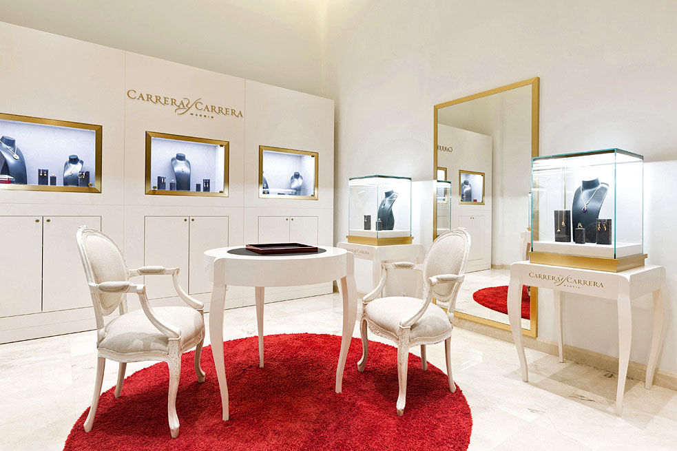 Второй этаж выполнен лаконичнее, ведь здесь разместились не украшения с драгоценными камнями, а коллекции из серебра. Так или иначе, любое изделие Tiffany & Co. можно рассмотреть с трех сторон в высоких стеклянных витринах и примерить, присев на высокие эргономичные стулья. Черно-белые архитектурные виды Нью-Йорка на стенах напоминают о происхождении этой ювелирной марки.