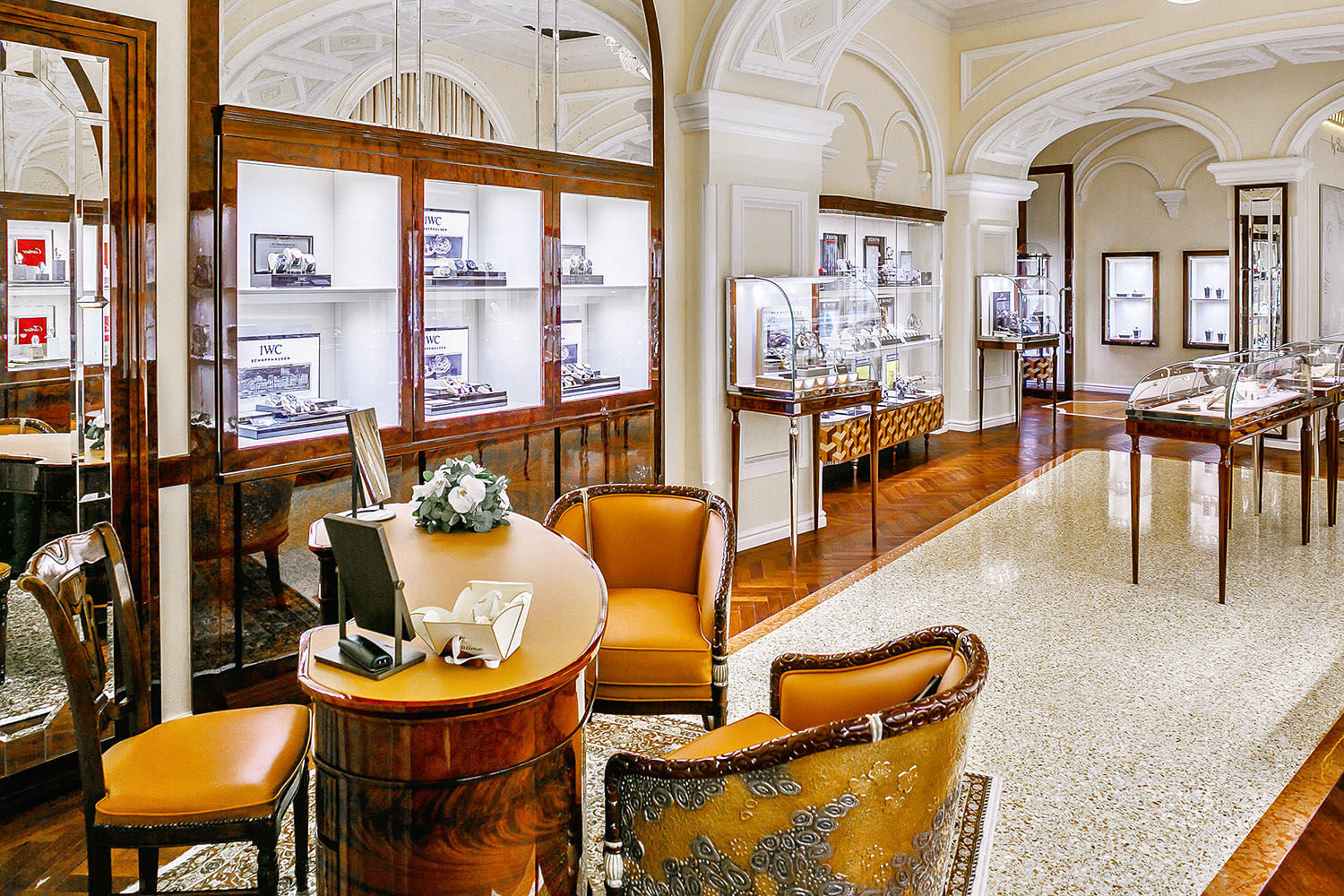 Интерьер нового магазина повторяет концепцию, которую можно видеть в столичном ГУМе. В свое время его облик был продиктован историческим псевдорусским стилем некогда «Верхних торговых рядов» архитектора Александра Померанцева. Дизайнеры Bosco добавили к сводчатым потолкам и бежевым стенам с белой лепниной ярких, характерных деталей: шкафы из орехового и кленового дерева с разнообразным маркетри, «пузатые» витрины, столы и кресла из карельской березы и дуба с отделкой бежевой кожи, множество венецианских зеркал. Подобное же пространство, с теми же специально воспроизведенными здесь сводчатыми потолками, мраморным полом и классическим паркетом, ярко освещенное люстрами в стиле советского ампира, повторено в новом Sublime by Bosco. Разнообразных шкафов, витрин и консолей в бутике такое множество, что все представленные здесь часовые и ювелирные бренды демонстрируют полный спектр своих коллекций.