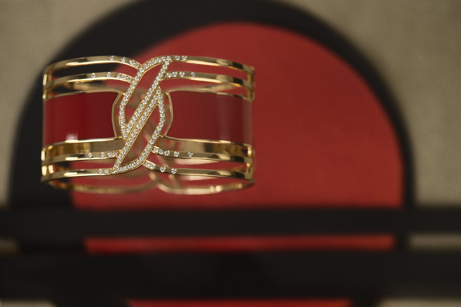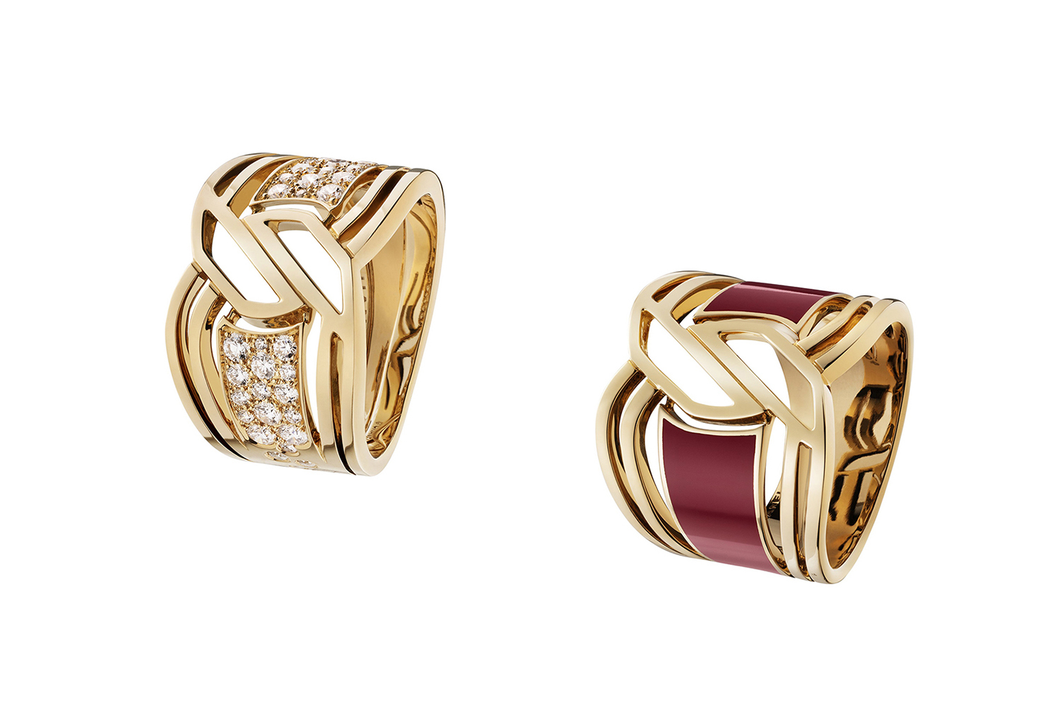 В линии My Red браслет-манжета и кольцо имеют единую конструкцию и совсем лаконичный дизайн. Выразительность стилеобразующего силуэта здесь передана лишь тонкими ажурными линиями из розового золота, широкими лентами из красной керамической эмали (на самом деле – особого керамического композита HyCream) и россыпью бесцветных бриллиантов.