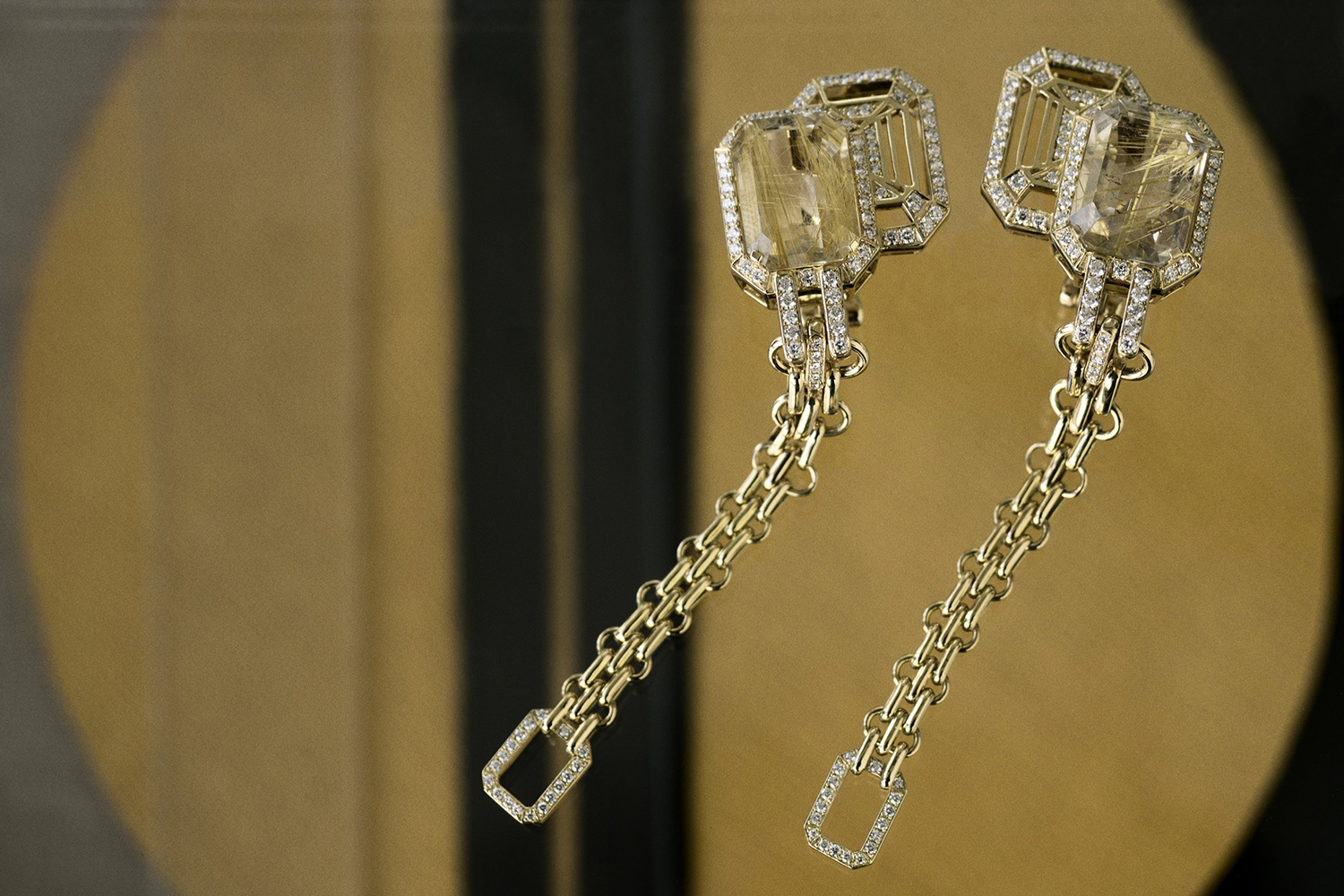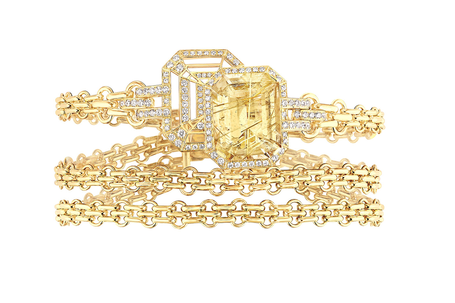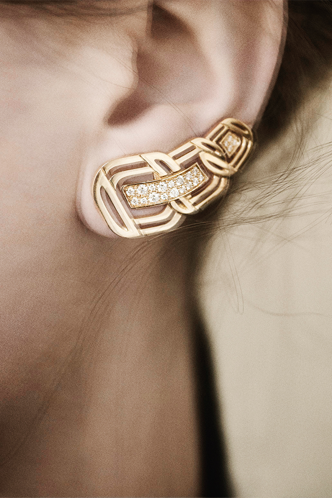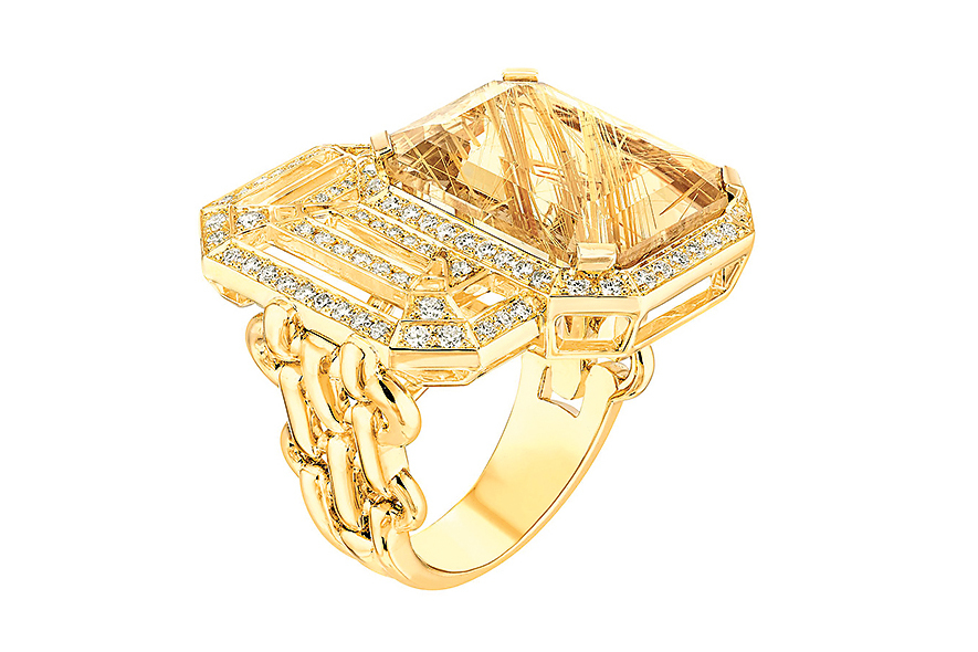 Упомянутая выше как один из элементов украшений цепочка от сумки 2.55 выступает таковым в линии My Chain. Восьмиугольник из рутилового кварца все той же изумрудной огранки, словно эхо или тень, повторяется в каждом украшении той же формой из желтого золота и бриллиантов. Длинные цепочки ниспадают драгоценными шнурами в серьгах и колье, застывают жесткой конструкцией в переплетении браслетов и в основе колец. В этой линии украшений присутствует одно, где геометрическая строгость даже принимает игривый оборот – в серьгах-каффах трижды воспроизведенный восьмиугольный силуэт уменьшается по мере «восхождения» по мочке уха.