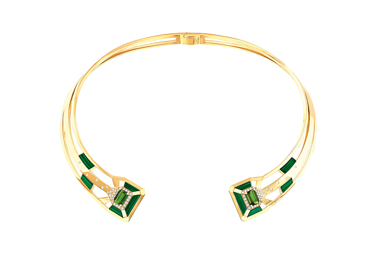 Двенадцать украшений поделены на три темы по цвету драгоценных материалов, из которых они созданы. Линия My Green состоит из колье-чокера, браслета-манжеты и кольца из желтого золота. Форма Вандомской площади здесь составлена из центрального сочно-зеленого турмалина изумрудной (как раз восьмиугольной!) огранки, по периметру окруженного линиями из вторящего ему по цвету малахита и подчеркнутого россыпью бриллиантов. У конструкций чокера и браслета – разомкнутые концы со смотрящими друг на друга драгоценными восьмиугольниками, и это усиливает гипнотичность графики украшений.
