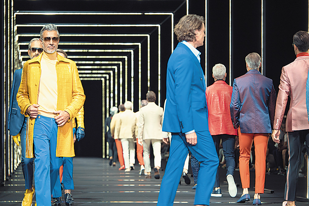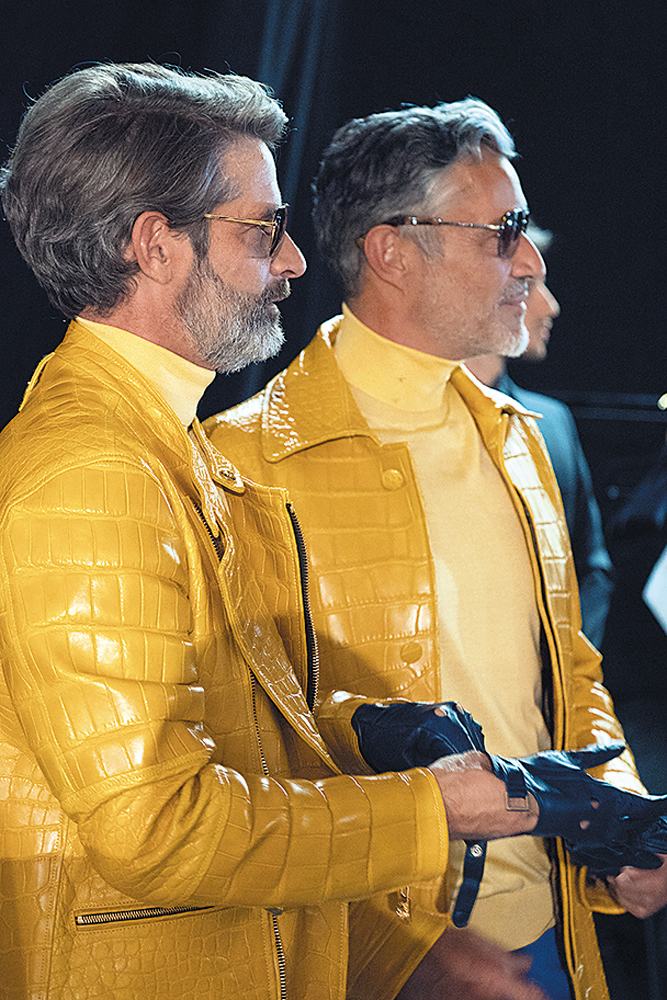 Крокодиловые тренчи в розовом и бирюзовом оттенках, ярко-синие костюмы и кожаные монки с двойной металлической пряжкой в красном и желтом вариантах – бодрая цветовая палитра напоминает об экзотических локациях нашего героя: Сен-Тропе, Сен-Бартелеми, Белиз и, конечно же, родная Бонду Ямайка, где британец Ян Флеминг и написал 14 новелл об агенте 00.