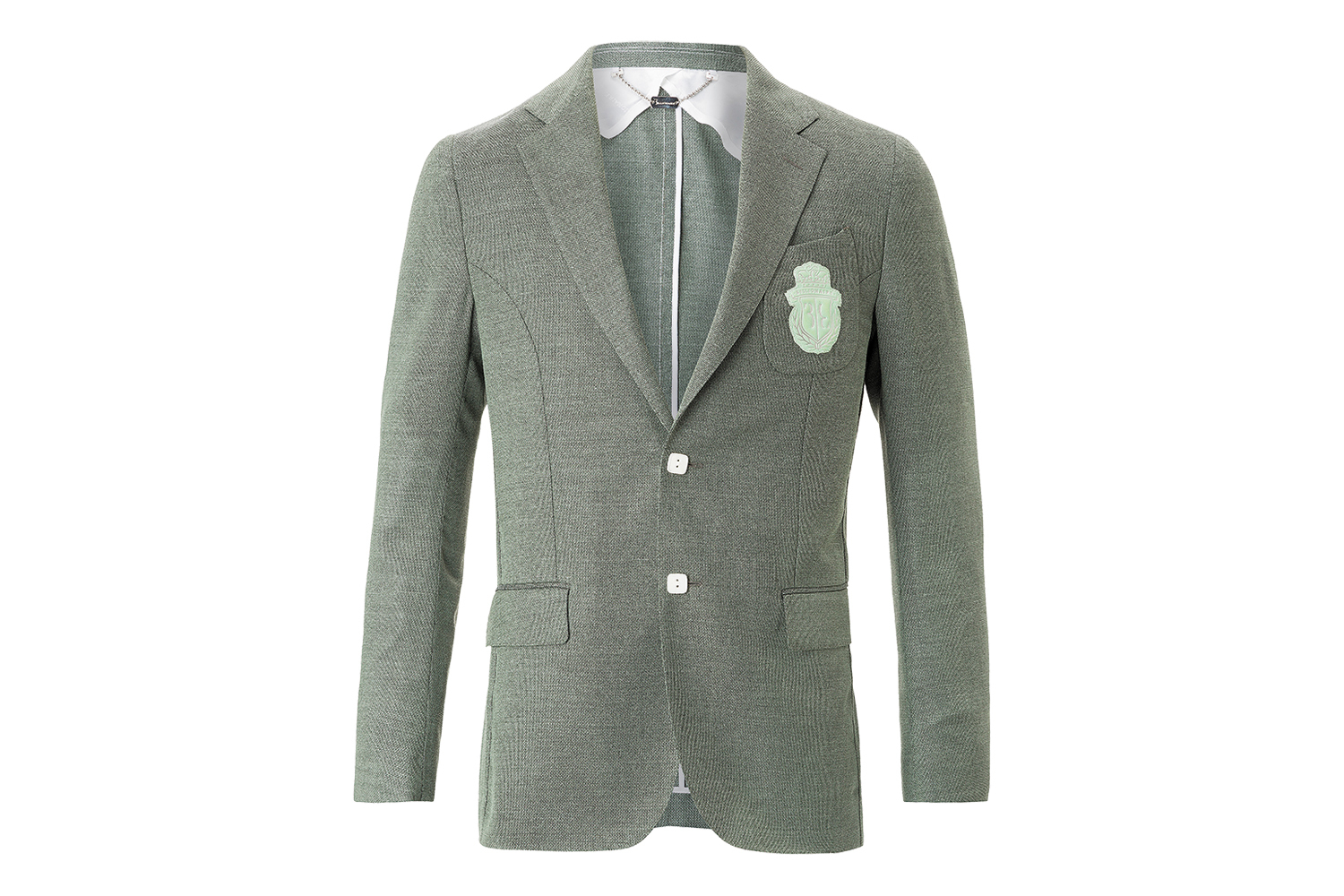 Смокинги украшены черными, словно олово, пайетками, позолоченными принтами льва – символа бренда, деталями из крокодиловой кожи. При прикосновении к золотым пайеткам на вечернем пиджаке возникает визуальный эффект «змеиной кожи». развивают тему тематические принты на спинах пиджаков: пистолет Бонда, украшенный изумрудами, и знаковая надпись «И целого мира мало», выполненная с использованием фиолетовых кристаллов.