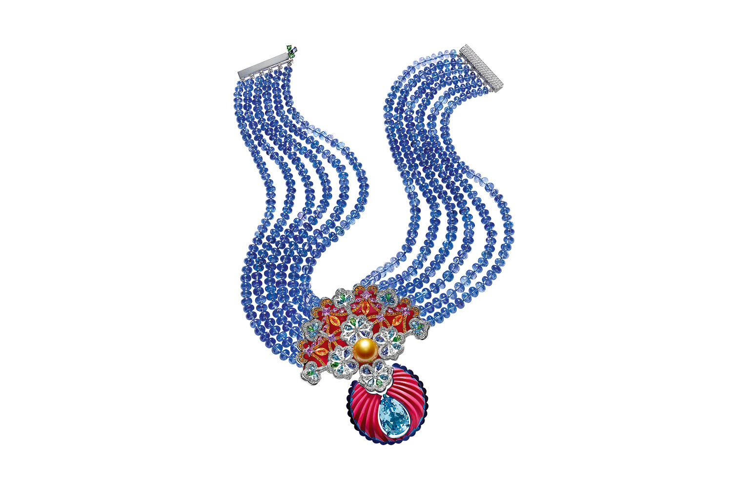 Самое интересное, что можно увидеть у Chopard, – это, конечно, не украшения на каждый день из коллекций Happy Diamonds и Ice Cube, но серьезные драгоценности, которые вскоре появятся на красных дорожках. Силуэты и композиции «этической» коллекции Green Carpet и коллекции Precious Chopard в этом году оказались похожи: изумруды и бриллианты огранки «груша» складываются в нежные геометрические орнаменты, слегка барочного толка, но не пышные, а выдержанные, подчеркивающие ценность драгоценных камней. На контрасте с этим благородством взрывом красок выглядели несколько украшений из коллекции Red Carpet 2018, премьера которой целиком будет дана как раз на Каннском кинофестивале. Каролина Шойфеле, креативный директор ювелирных коллекций Chopard, очевидно увлеклась стилем шинуазри – его отголоски явно видны и сочетании синих бусин сапфиров с россыпью цаворитов, бирюзы, фиолетовых всполыхов опалов и, разумеется, в облаках из перламутра.