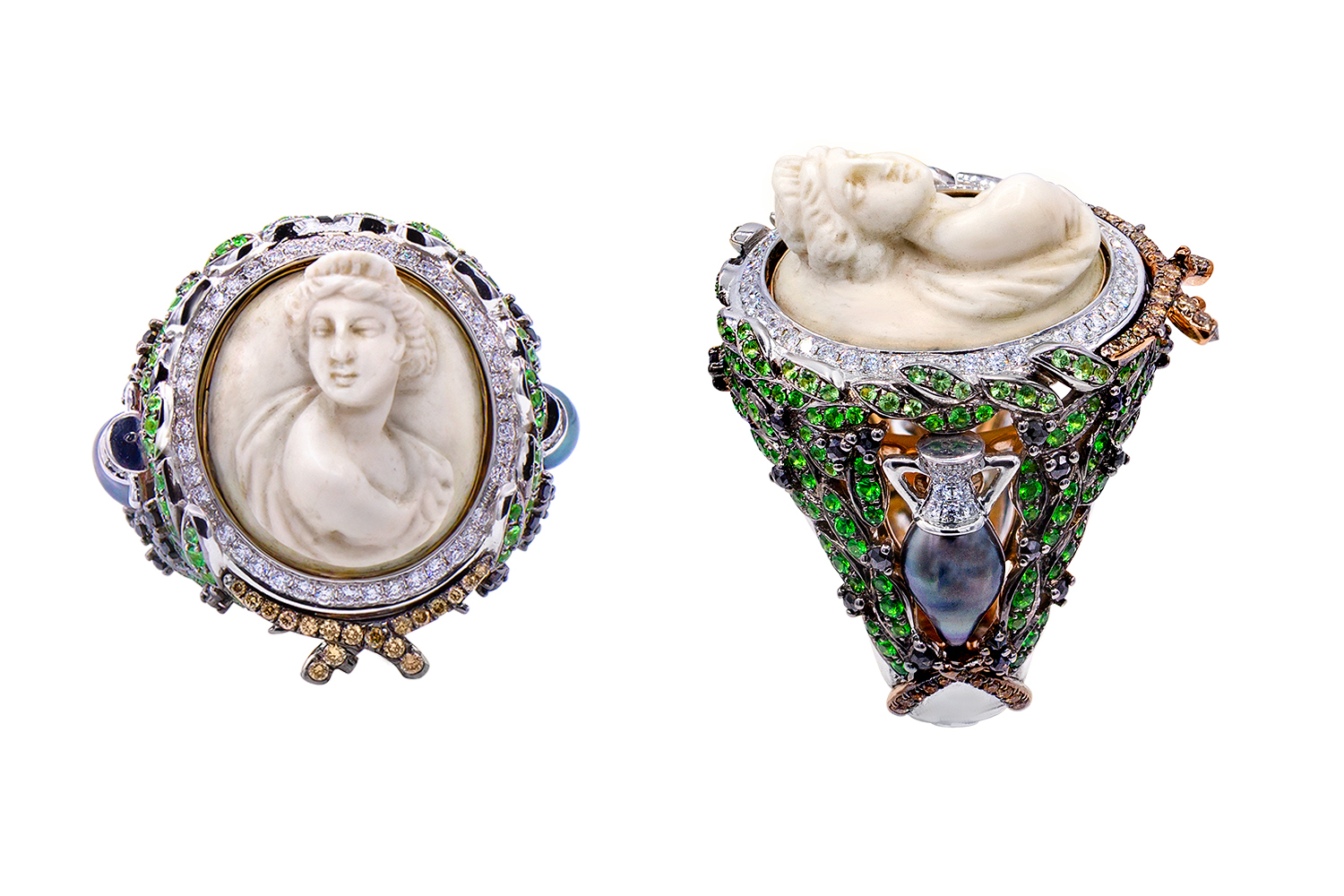 Итальянец Алессио Боски, уже не первый год слывущий одним из самых интересных независимых ювелиров Европы, теперь и вовсе был, пожалуй, главной звездой Базеля. Украшений интереснее по фантазийности, разнообразию сюжетов и уровню исполнения на выставке попросту не было. Разве какие-то изделия Cicada могли соревноваться с Alessio Boschi. В рамках коллекции Historica ювелир показал украшения со старинными камеями, вокруг которых он создал композиции в античном духе. По тому же принципу выполнены и изделия со старинными микромозаиками, которые Боски поместил в рамы из драгоценных камней, – и это сложное соединение прошлого и настоящего дается Боски с барочной легкостью. Фантазийные, фигуративные украшения в этом году ювелир создал вокруг барочного жемчуга – его неправильные формы Боски превратил в косяки экзотических рыб и в мифологического грифона.