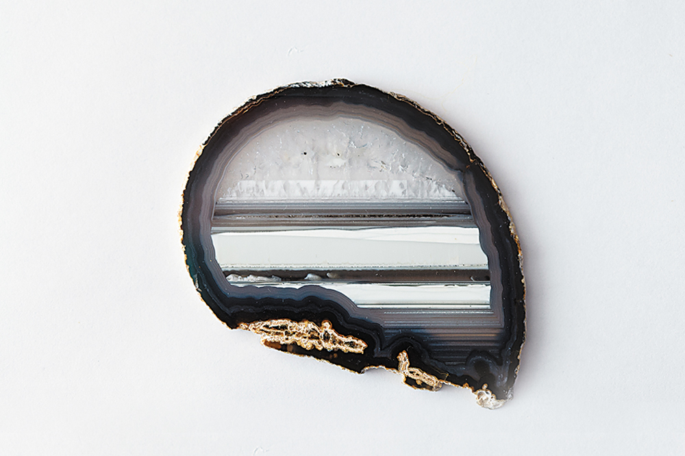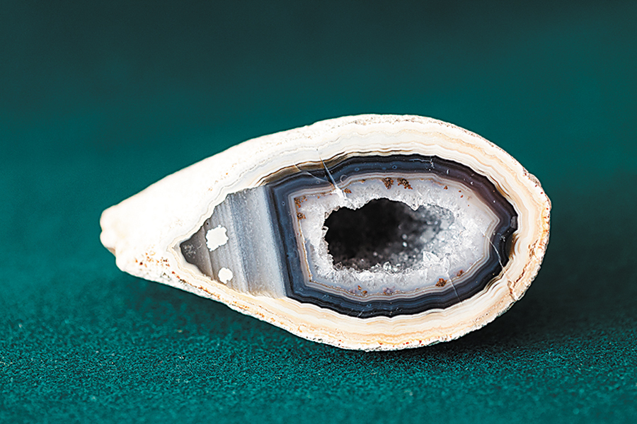 Для наглядности коллекционер демонстрирует агат, отполированный с одной стороны и необработанный с другой. Отполированная сторона камня поражает изумительным рисунком. Особый колорит минералу придает чередование слоев разного оттенка, чаще всего белого или серо-голубого. Иногда природа добавляет агату желтую, черную, красную или другую краску. Особенно поражают так называемые моховые или «пейзажные» агаты, на отполированном срезе которых можно разглядеть зимний пейзаж с замерзшей рекой и лесом или таинственный остров, окруженный океанскими водами.