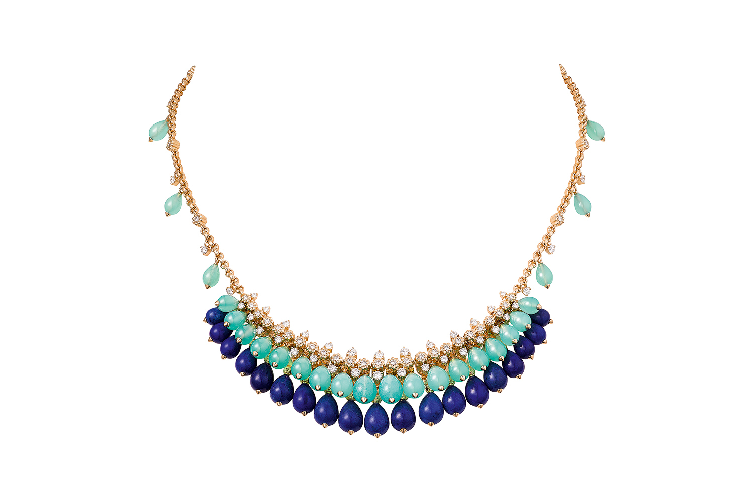 В первой части коллекции были представлены экземпляры в ярких цветах полудрагоценных камней, и сейчас в этой «оранжерее» появились украшения с сочетанием светло-зеленого хризопраза и синей ляпис-лазури. Миниатюрные кабошоны этих полудрагоценных камней стройным веером или широким воротником разложены в воображаемые соцветия «кактусов» и вкупе с акцентами бриллиантов составляют эффектные серьги, кольца, браслеты и даже колье. Это же объемное соцветие красуется ярким элементом и на застежке вечерних сумочек Cactus de Cartier – художественный замысел продолжают и в аксессуарах.