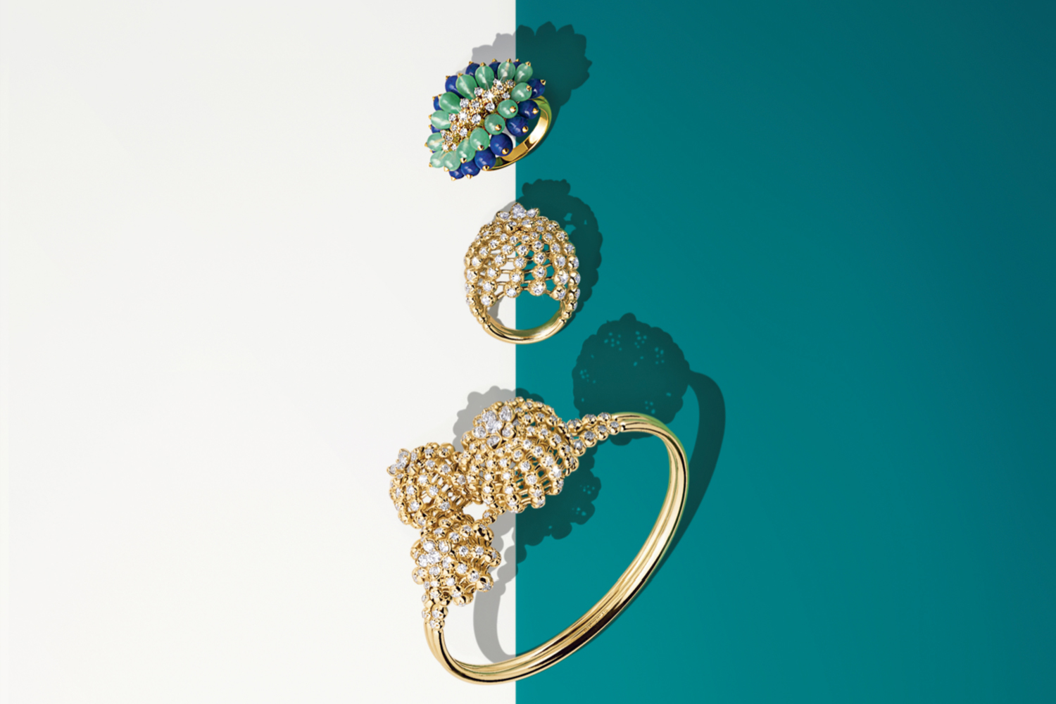 В какой-то степени они – продолжение первой части коллекции, итог ее «почкования». Тогда самым элементарным воплощением кактуса стали куполообразные, закрученные по спирали кольца и подвески из нитей желтого золота с применением техники гранулирования. Теперь в этом же ключе созданы и разного объема кольца из розового золота, а из золота желтого – серьги и браслет с теми же соцветиями бриллиантов на вершине.
