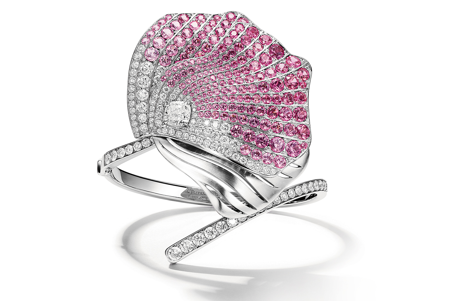 В той же розовой тональности решены и новые образчики драгоценной флоры Tiffany & Co. Плоские многослойные цветы словно вырезаны из бумаги, но больше напоминают модели японского оригами с лепестками в россыпи бриллиантов, розовых сапфиров или просто с продольными прорезями в платине. Более того, подобные броши или серьги из этой линии являются трансформерами, и их четыре лепестка можно немного повернуть вокруг центральной оси. Точно так же приоткрываются бутоны более объемных фигуративных цветов из «весеннего» сада Tiffany & Co.
