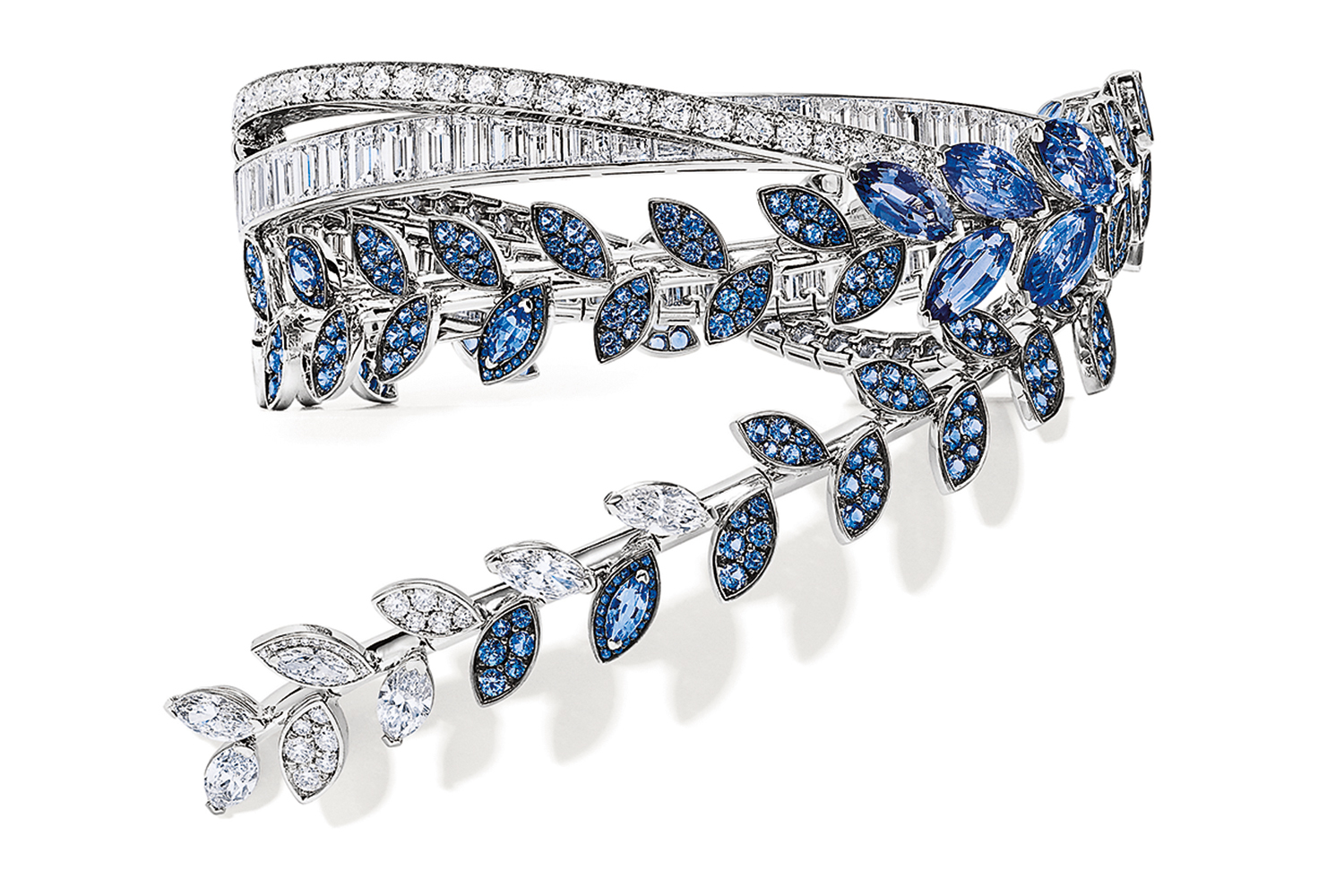 Часть коллекции под названием Spring также начинается с холодных тонов синих сапфиров и аквамаринов, только эти драгоценные камни мерцают в нежной весенней флоре. Интересно, что большинство цветочных украшений здесь являются более сложным воплощением коллекции Paper Flowers и здесь точно так же архетипичная форма гортензии словно бы вырезана из бумаги, а не платины. Эти «вырезанные», тронутые россыпью бесцветных бриллиантов или синих сапфиров четыре лепестка словно бы произвольно, как букет, сложены в пышные композиции серег и колец и в более сложные по объему браслеты-манжеты и колье. Примечательно, что четыре лепестка этого нового цветка Tiffany & Co. усеяны не только синими, но и розовыми сапфирами в других версиях украшений. И здесь их сердцевиной не выступает уже синий танзанит весомой огранки, а сквозь их хаотичный объем проглядывает розовый турмалин.