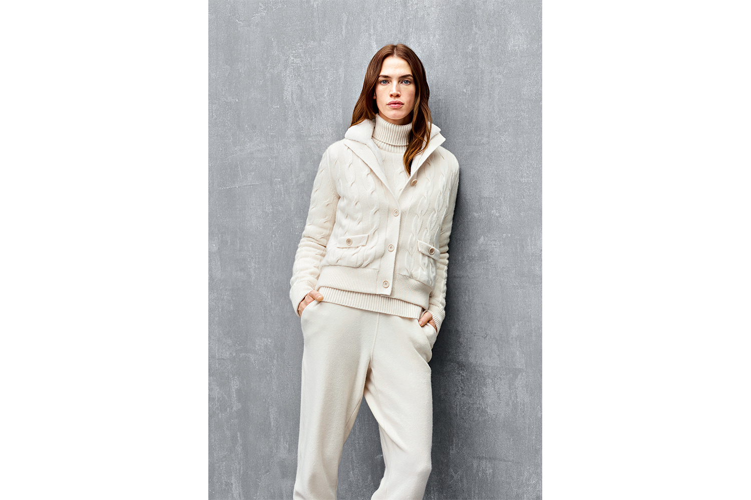 В коллекцию вошли два свитера с высоким воротом, а также уютная кофта-куртка с норковой подкладкой, перламутровыми пуговицами и съемным воротником из меха шиншиллы. Все вещи – кипенно-белого цвета: последний призван символизировать чистоту и нежность этого уникального кашемира.