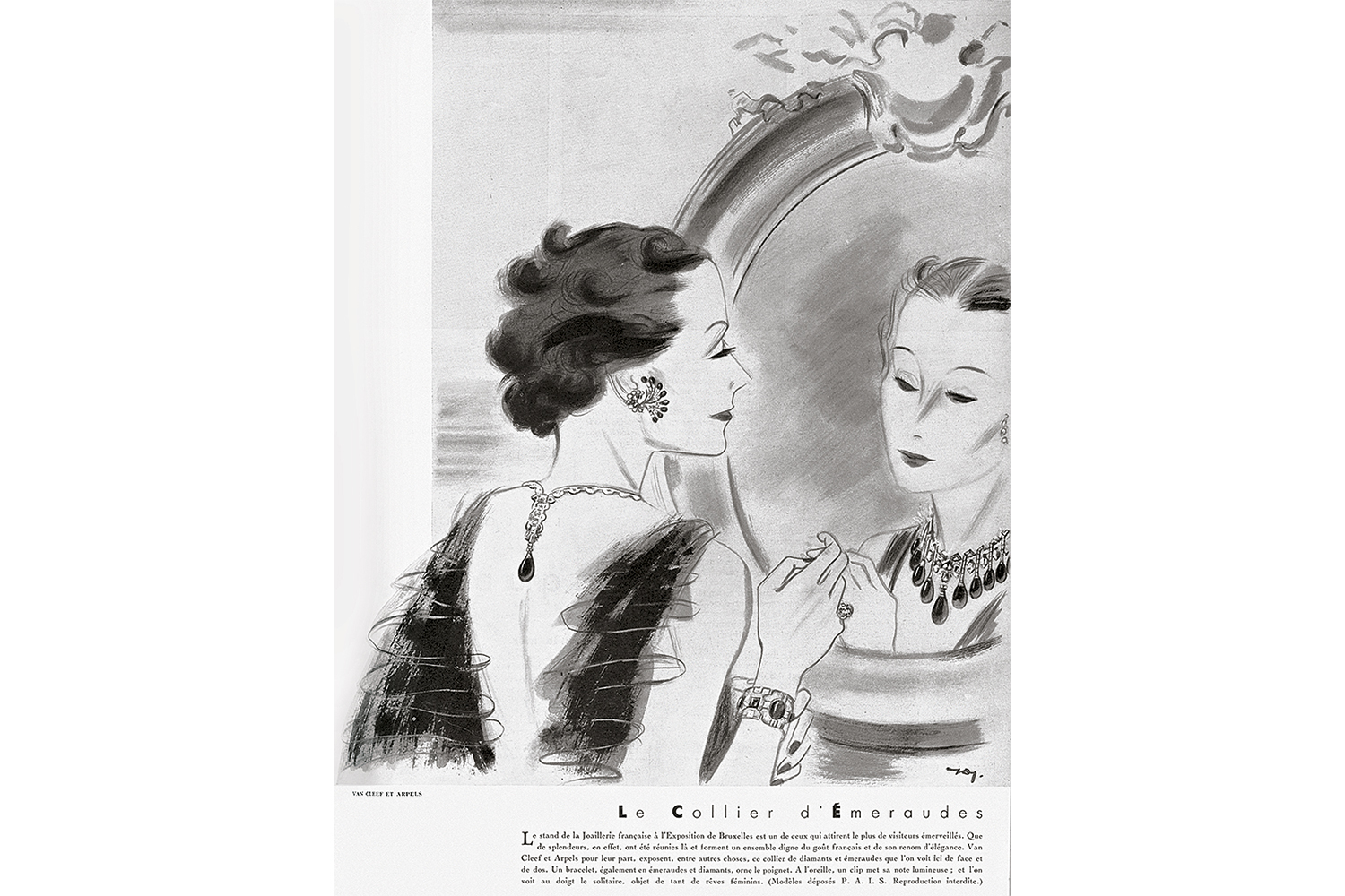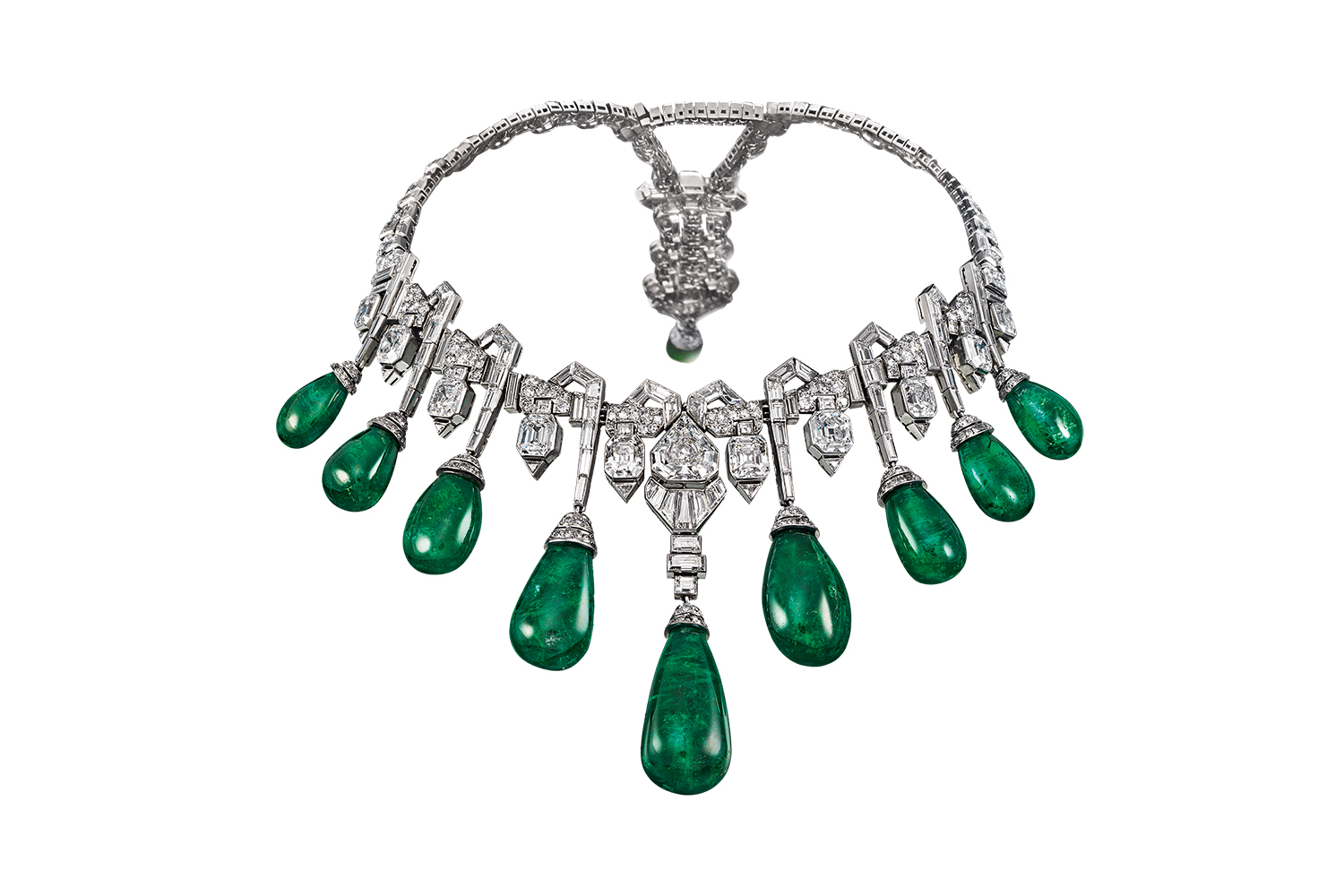1930-е годы отмечены первыми крупными заказами, и один из таких имеется на выставке: колье Collerette в стиле ар-деко с десятью великолепными колумбийскими изумрудами общим весом 165 карат когда-то принадлежало египетской принцессе Фаизе, дочери короля Фуада. Этот раритет был приобретен Домом на аукционе Christie’s в ноябре 2013 года за рекордные $4,5 млн.
