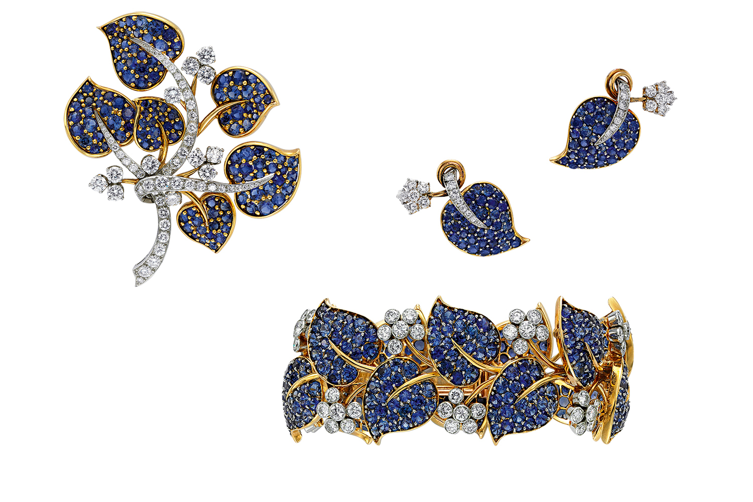 1950-е – это расцвет флористических мотивов в бренде: на выставке представлено сразу несколько брошей в виде букетов. Самые примечательные украшения с цветочным мотивом – серьги, брошь и браслет из бриллиантов и синих сапфиров, принадлежавшие Марджори Мерривезер Пост, богатой американской наследнице агропромышленной империи General Food Inc., преданной клиентки Van Cleef & Arpels.
