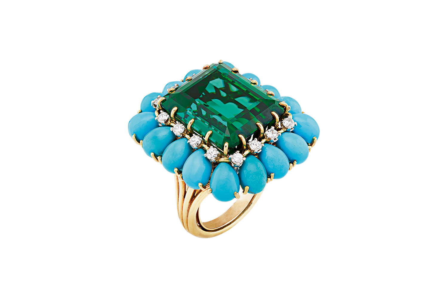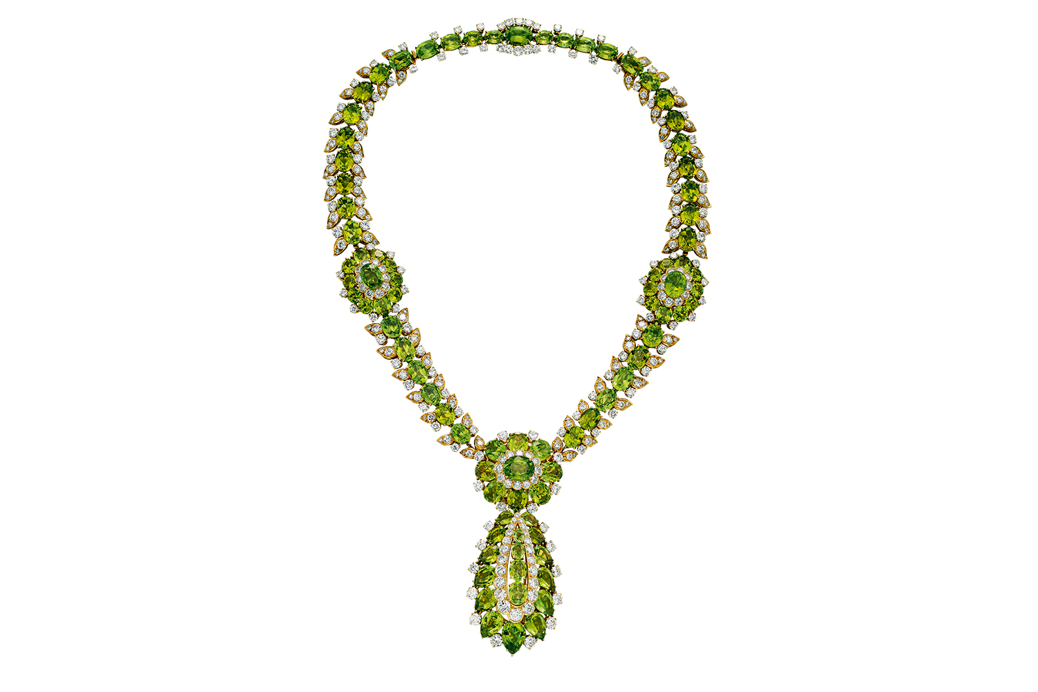 Творческий подъем ювелиров в 60-х годах знаменуется взрывом цветов и пышных форм – его иллюстрирует гарнитур из крупных сияющих зеленых полудрагоценных перидотов, принадлежавший еще одной американской наследнице, Пегги Рокфеллер. Украшения совсем недавно, в июне 2018 года, были приобретены Van Cleef & Arpels на аукционе Christie’s за «скромные» $348 500.