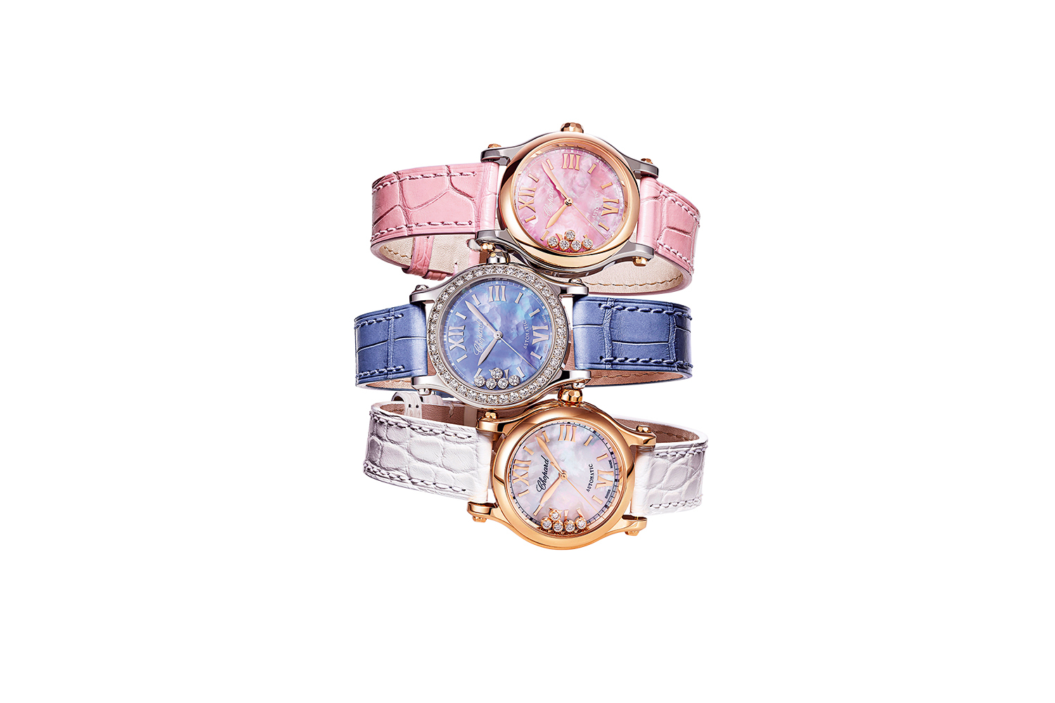 За прошедшие четверть века Happy Sport получили более тысячи (!) вариаций, созвучных стилистическим новшествам и социальным изменениям. В 2002 году бриллианты вместе с цветными драгоценными камнями приняли форму рыбок Happy Fish. В 2003-м двигались среди золотых спиралей Happy Spirit. В 2005-м, в честь Каннского кинофестиваля, появилась модель Happy Star Festival de Cannes с «плавающей» пальмовой ветвью из золота. А еще были Happy Sport Zebra, Happy Sport Mickey и Happy Sport Panda с тематическими изображениями на циферблатах...