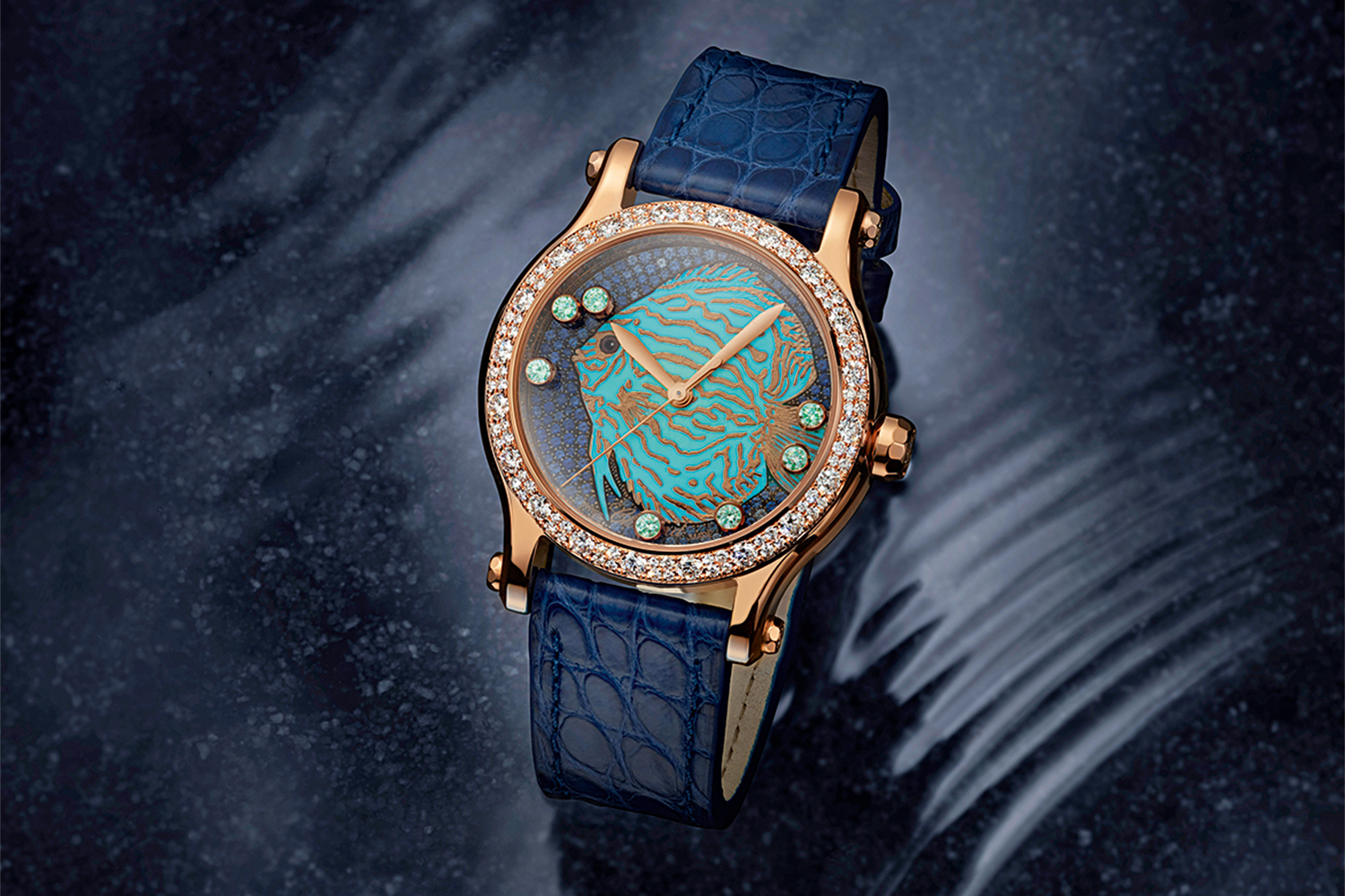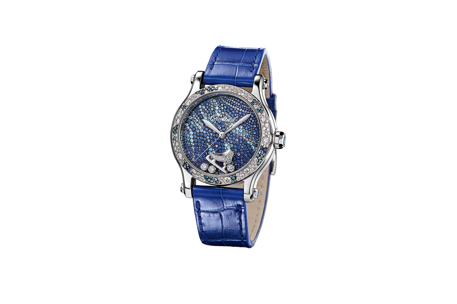 Циферблаты пяти моделей Happy Sport Tatiana Navka Edition декорированы графическим узором, напоминающим следы от коньков на льду, а внутри, под сапфировым стеклом, скользят не только happy diamonds, но и миниатюрный золотой конек, усыпанный бриллиантами.