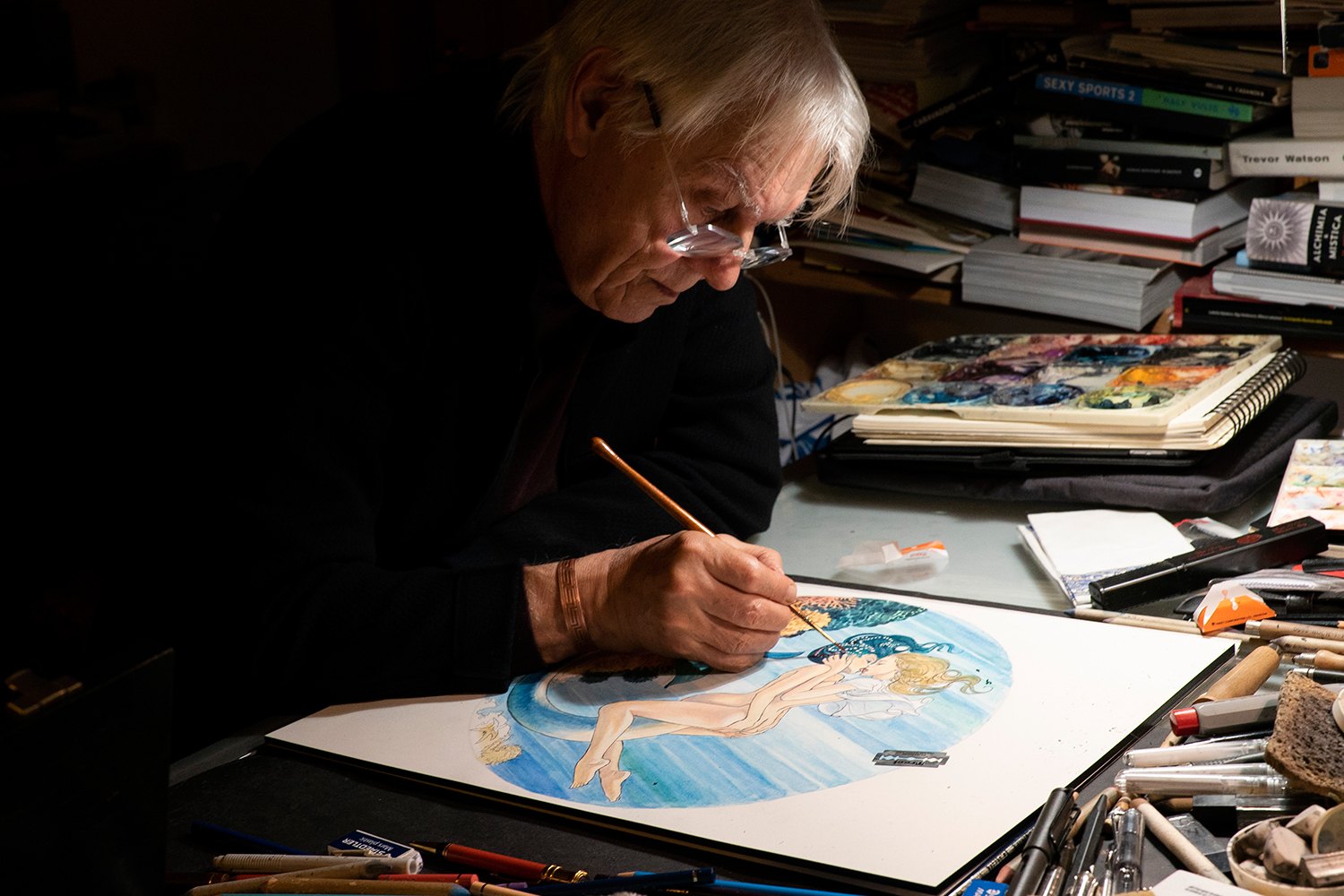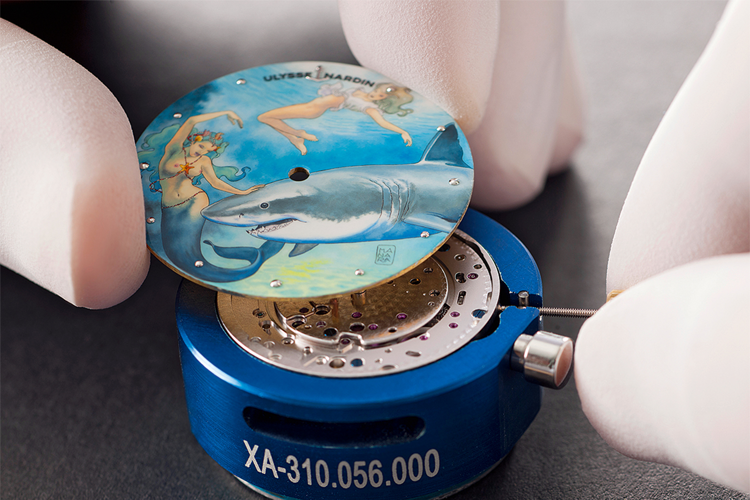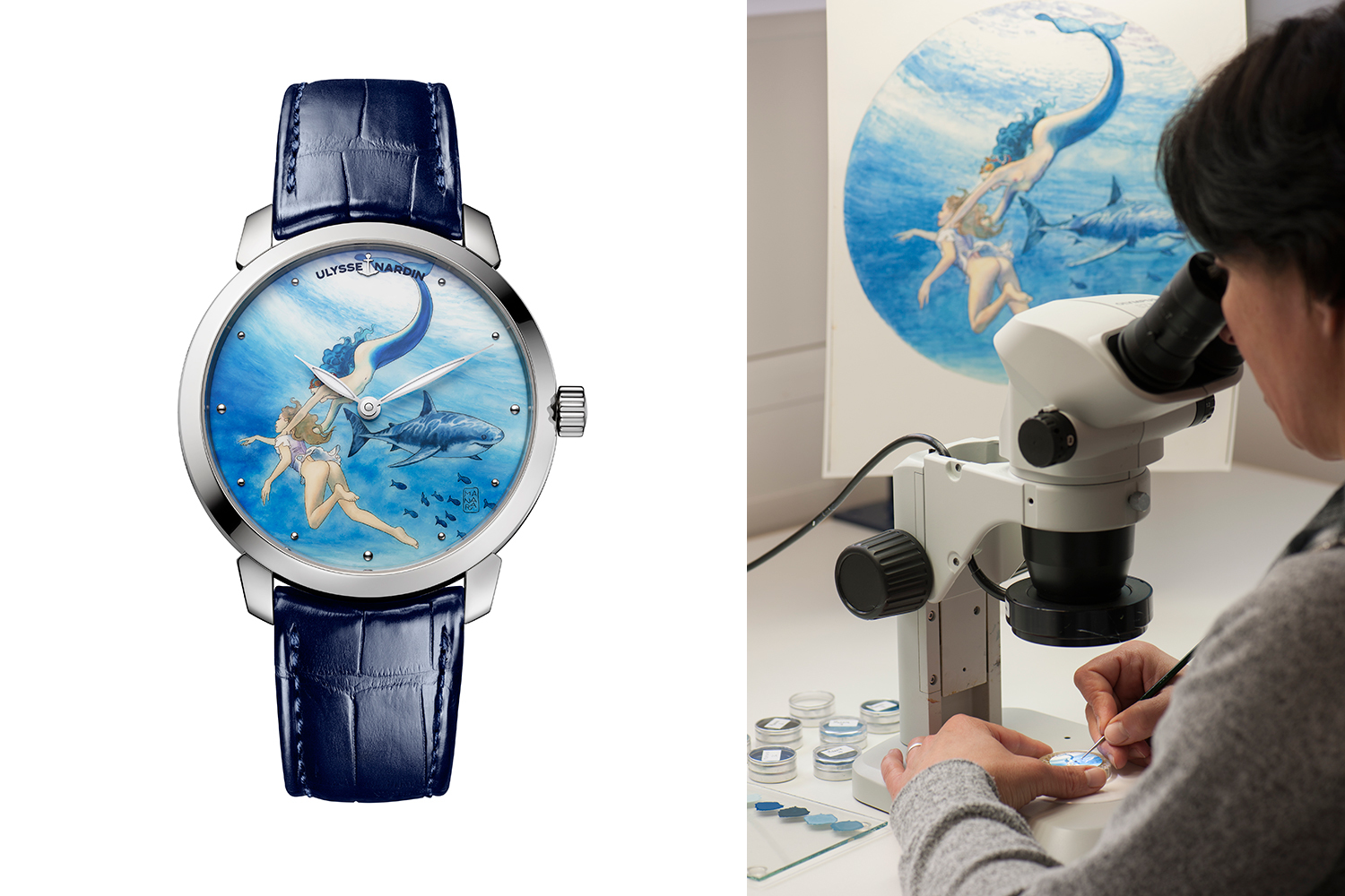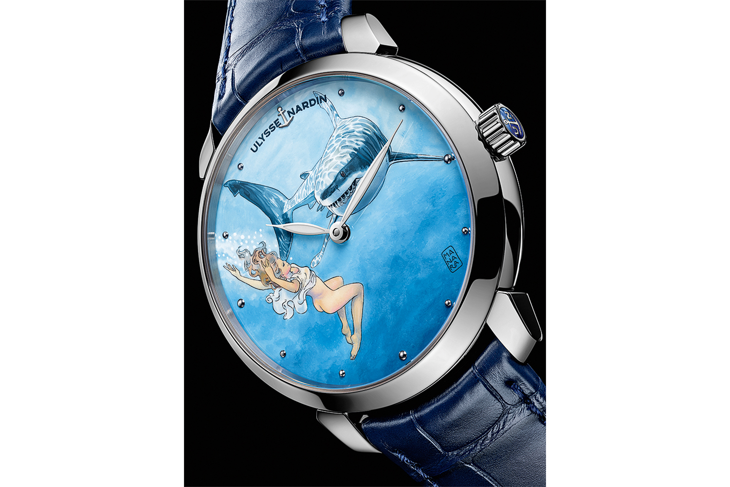 ...Первое удивление от предложения Ulysse Nardin у Манары прошло довольно быстро, когда тот вспомнил, что в этом часовом бренде создаются часы на эротическую тему, а значит, к нему обратились с веским основанием. Романтический сюжет будущих циферблатов предложили из штаб-квартиры Ulysse Nardin в Ле-Локле – море, яхта, одинокая девушка за ее штурвалом, которая решила искупаться; из глубины внезапно появляется акула; и спасает от нее героиню так же внезапно возникшая из подводного мира русалка; следом между девушками завязывается эротическая игра, – и этот сюжет сразу понравился Манаре! Сам заядлый яхтсмен и любитель мифологии, он оценил интригу вперемежку с опасностью, а также тонкую связь с морскими хронографами бренда. На основе этой истории Манара создал у себя в студии в Вальполичелле десятки вариаций ее развития в свойственной ему откровенной и чувственной манере. В итоге из эскизов художника в Ulysse Nardin выбрали к реализации десять.