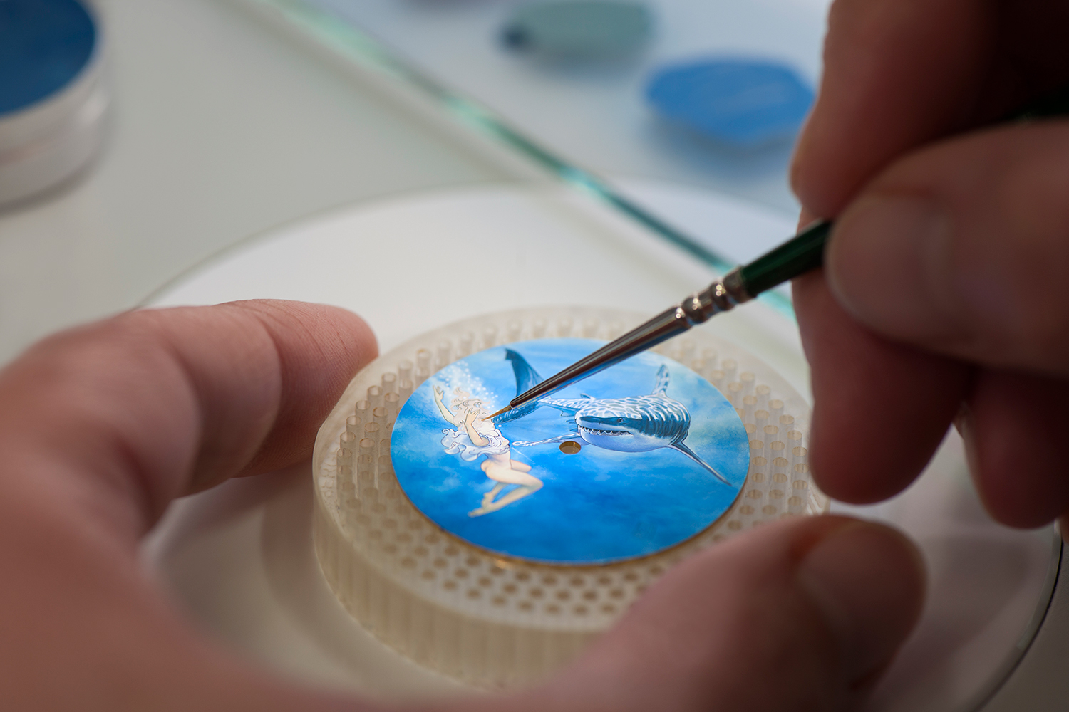 Каждому из двух мастеров-миниатюристов на мануфактуре понадобилось около 50 часов кропотливой работы, чтобы воплотить сюжет на циферблате и сохранить в нем всю игру красок, все блики, полутона авторского рисунка. Создается такой рисунок акриловыми красками кисточкой не толще человеческой ресницы, а после окончания работы над ним следует процесс покрытия поверхности лаком, чтобы надолго закрепить краски. Каждый такой циферблат уникален, ведь и в росписи вручную у мастеров проявляются свои нюансы и едва различимые особенности при общности следования стилю Мило Манары.