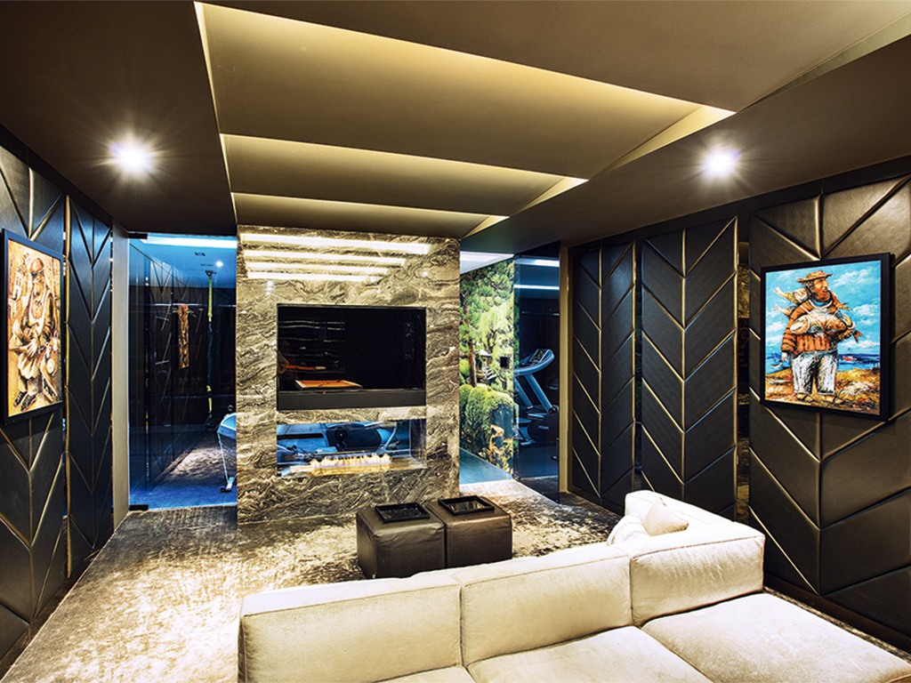 Центральное место в доме отдано винтовой лестнице (SMET), на которую нанизаны этажи и пространства. Марши натуральной древесины обрамлены парапетами бежевого стекла. В нишах притаились глиняные скульптурки художника Дмитрия Кравцова. Стены в доме выкрашены в серые оттенки, но благодаря ручной финишной обработке приобрели разнообразную фактуру. В домашнем кинотеатре стены «шумоизолировали», укрыв искусственной кожей.