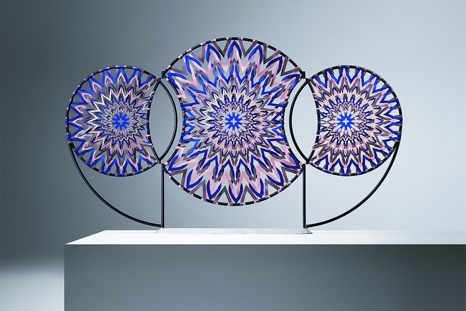 Дизайнеры Джорджия Занеллато и Даниэле Бортотто основали собственную студию Zanellato/Bortotto в 2013 году. Дом Louis Vuitton привлек их к сотрудничеству впервые, и дебютирует дуэт с оригинальным предметом Mandala. Металлическая в своей основе декоративная ширма сот-кана из полосок кожи трех цветов, и ее причудливый узор действительно напоминает геометрический орнамент сакрального символа мандалы. Одновременно техника плетения кожи позаимствована у кочевых народов – этот древний декоративный прием смотрится неожиданно минималистично и свежо.