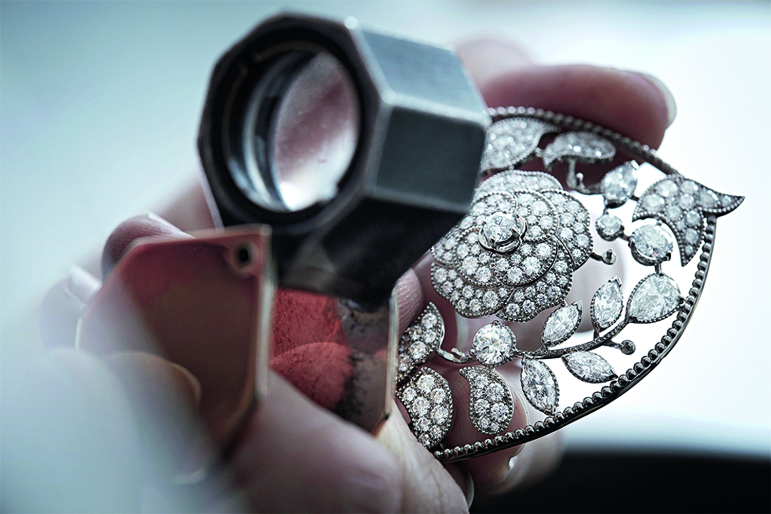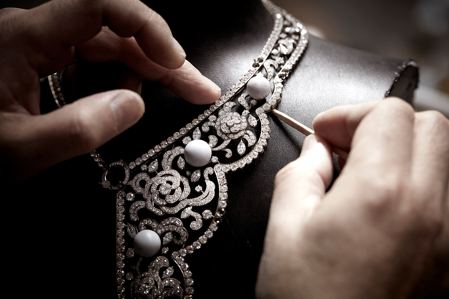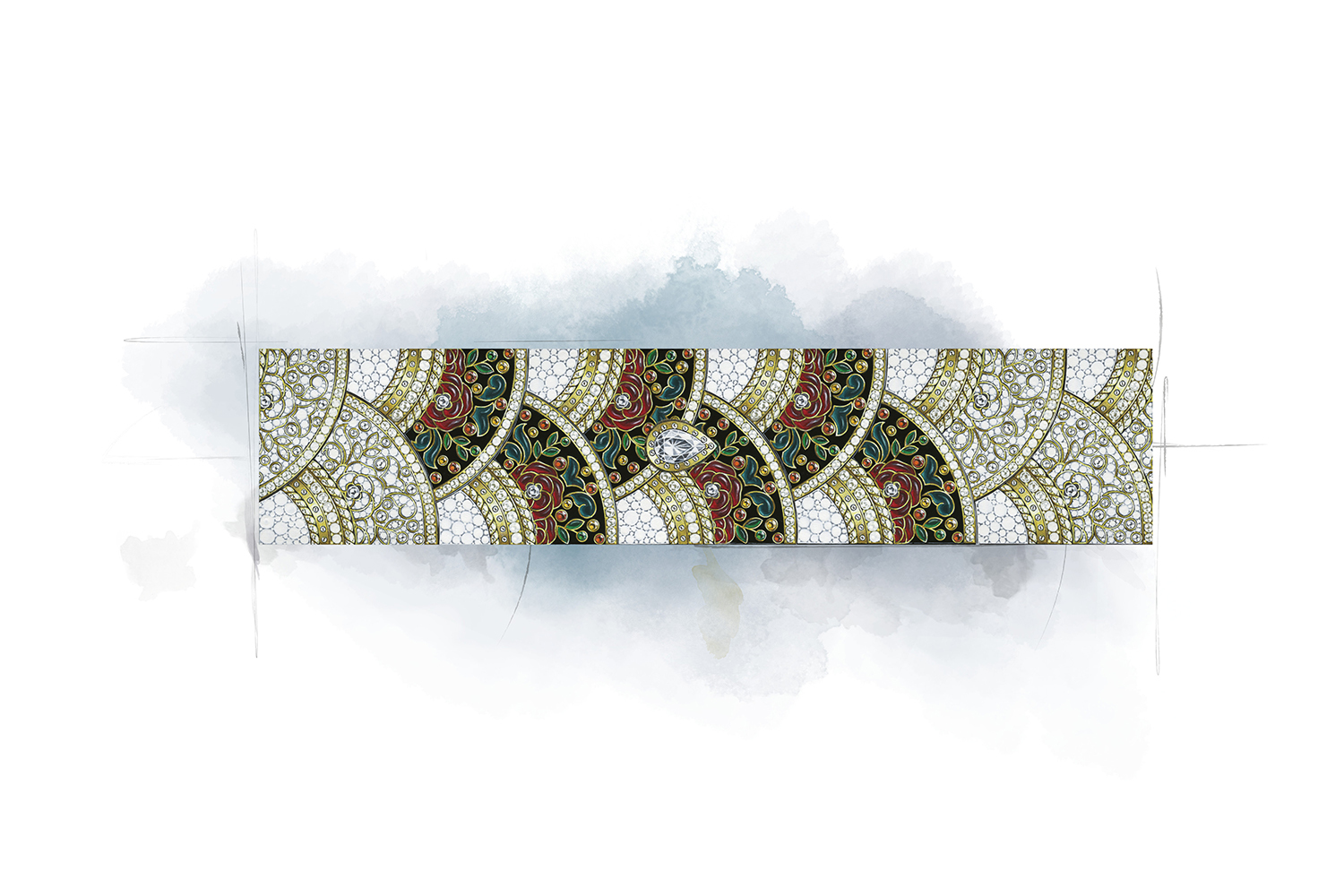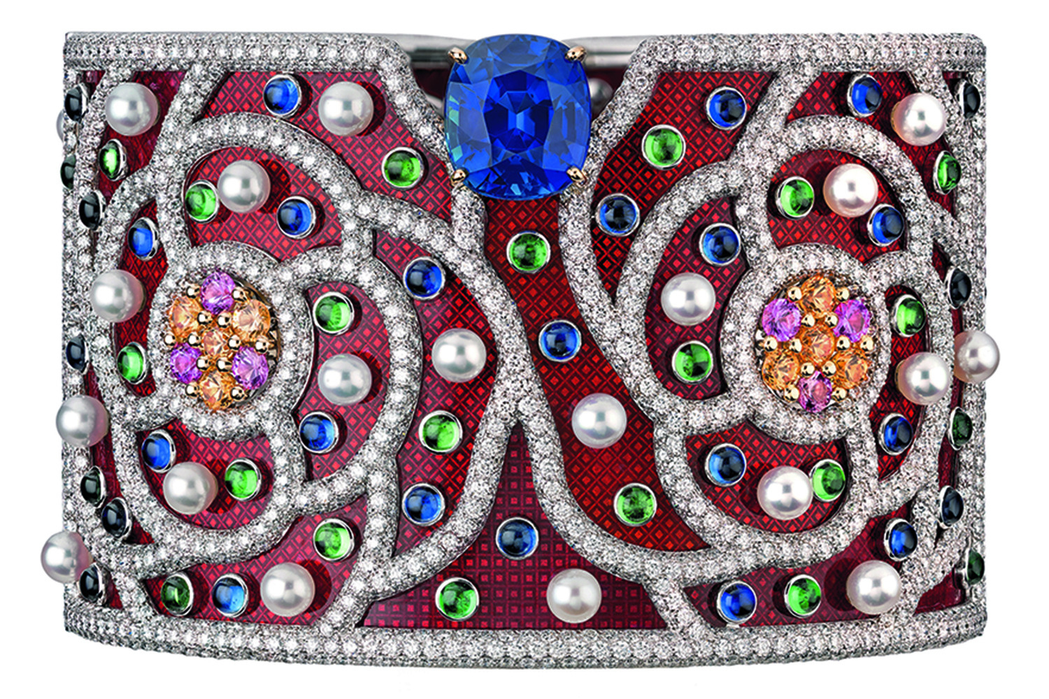 Пышные формы драгоценного головного убора напоминают русский кокошник, а в орнамент всех украшений линии органично вписана камелия – главный талисман Мадемуазель и сюжет десятка ювелирных коллекций Дома. Украшения из линии Roubachka «расшиты» на скифский манер не только стилизованными золотыми шнурами с офицерских мундиров, колосками и камелиями, но и ровными рядами белоснежного жемчуга. Колье-воротник из этой линии – одно из самых дорогих во всей коллекции: по его центру красуется желтый бриллиант весом 9,5 карата. Тема традиционных византийских по происхождению русских орнаментов остроумно разыгрывается в линии Folklore – на фоне эмали цвета кремлевских стен выложен рисунок из кабошонов цветных драгоценных камней, разграниченный бриллиантовыми линиями. Стоит максимально удалиться от украшения, и линии складываются в силуэт камелии.